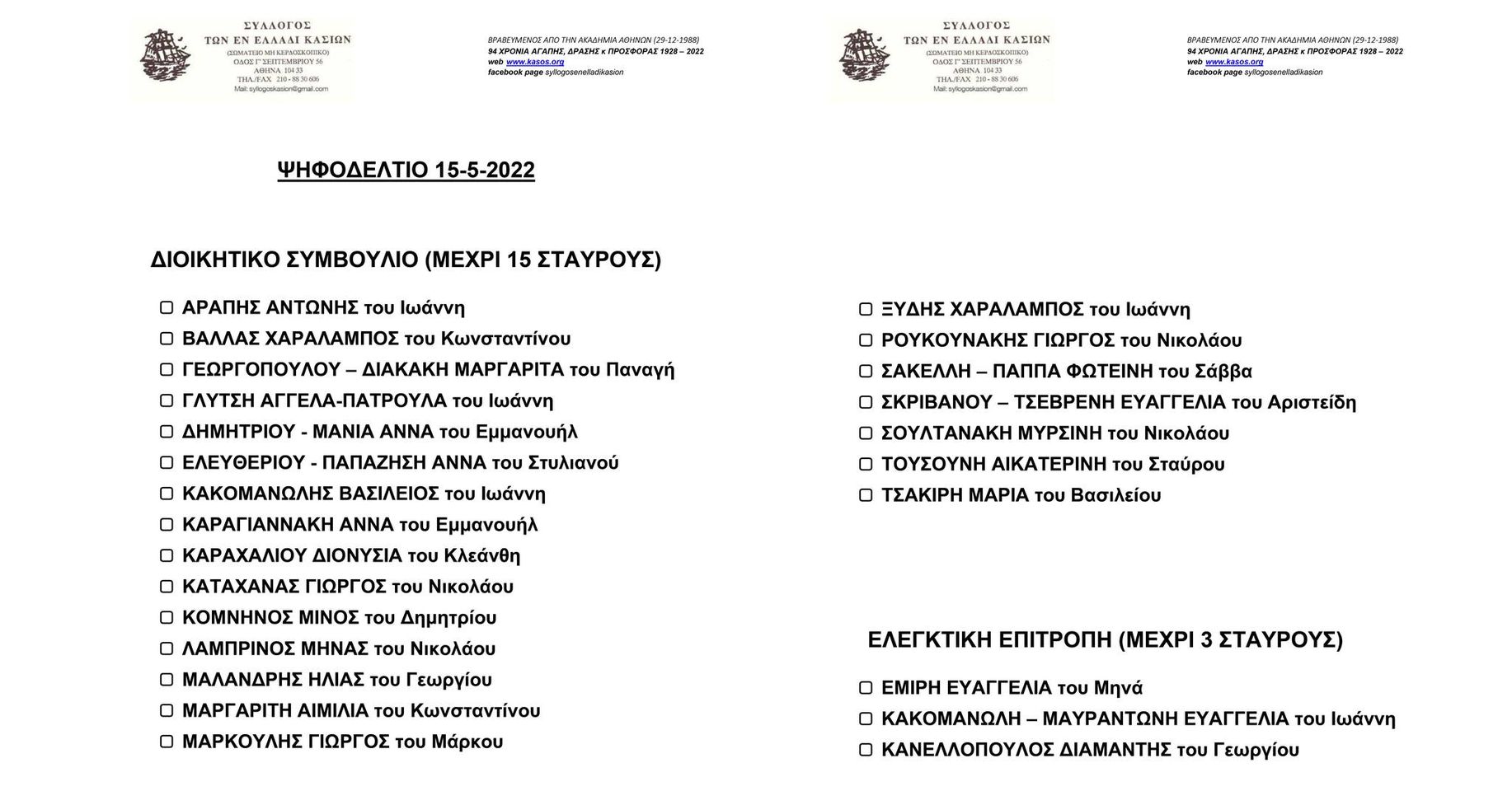 Το Διοικητικό Συμβούλιο του Συλλόγου των Εν Ελλάδι Κασίων καλεί όλα τα μέλη και σύμφωνα με το άρθρο 11 του καταστατικού του σε Γενική Συνέλευση και Διενέργεια εκλογών την Κυριακή 8 Μαίου 2022 στις 10.30πμ στα γραφεία του Συλλόγου (3ης Σεπτεμβρίου 56, β’όροφος).