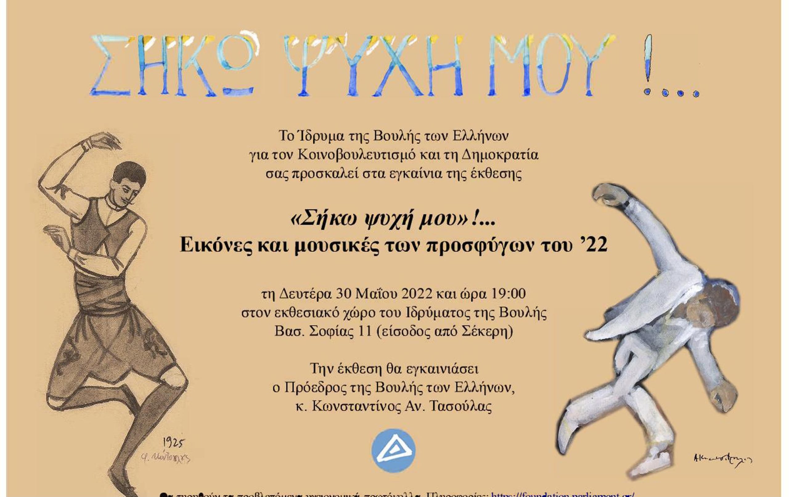 Ο Πρόεδρος της Βουλής των Ελλήνων, κ. Κωνσταντίνος Τασούλας, θα εγκαινιάσει την έκθεση του Ιδρύματος της Βουλής για τον Κοινοβουλευτισμό και τη Δημοκρατία «ΣΗΚΩ ΨΥΧΗ ΜΟΥ»!… Εικόνες και μουσικές των προσφύγων του ’22, τη Δευτέρα 30 Μαΐου 2022, ώρα 19:00, στον εκθεσιακό χώρο του Ιδρύματος.