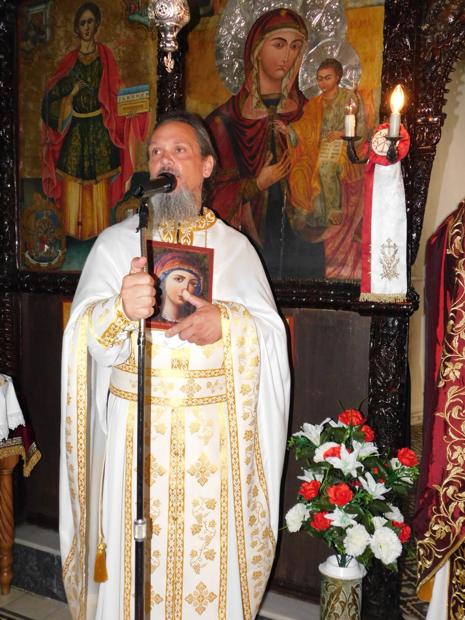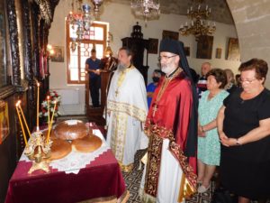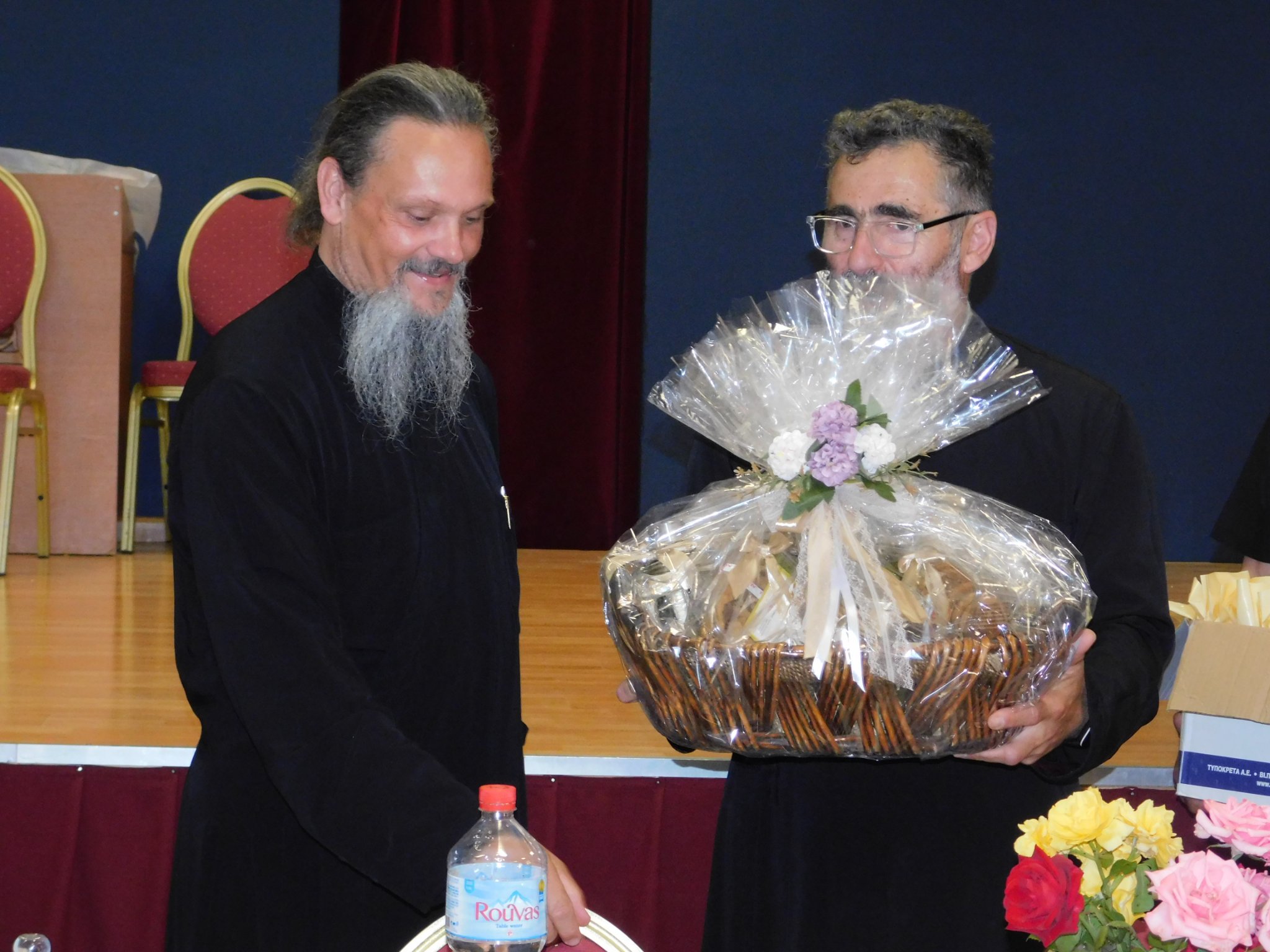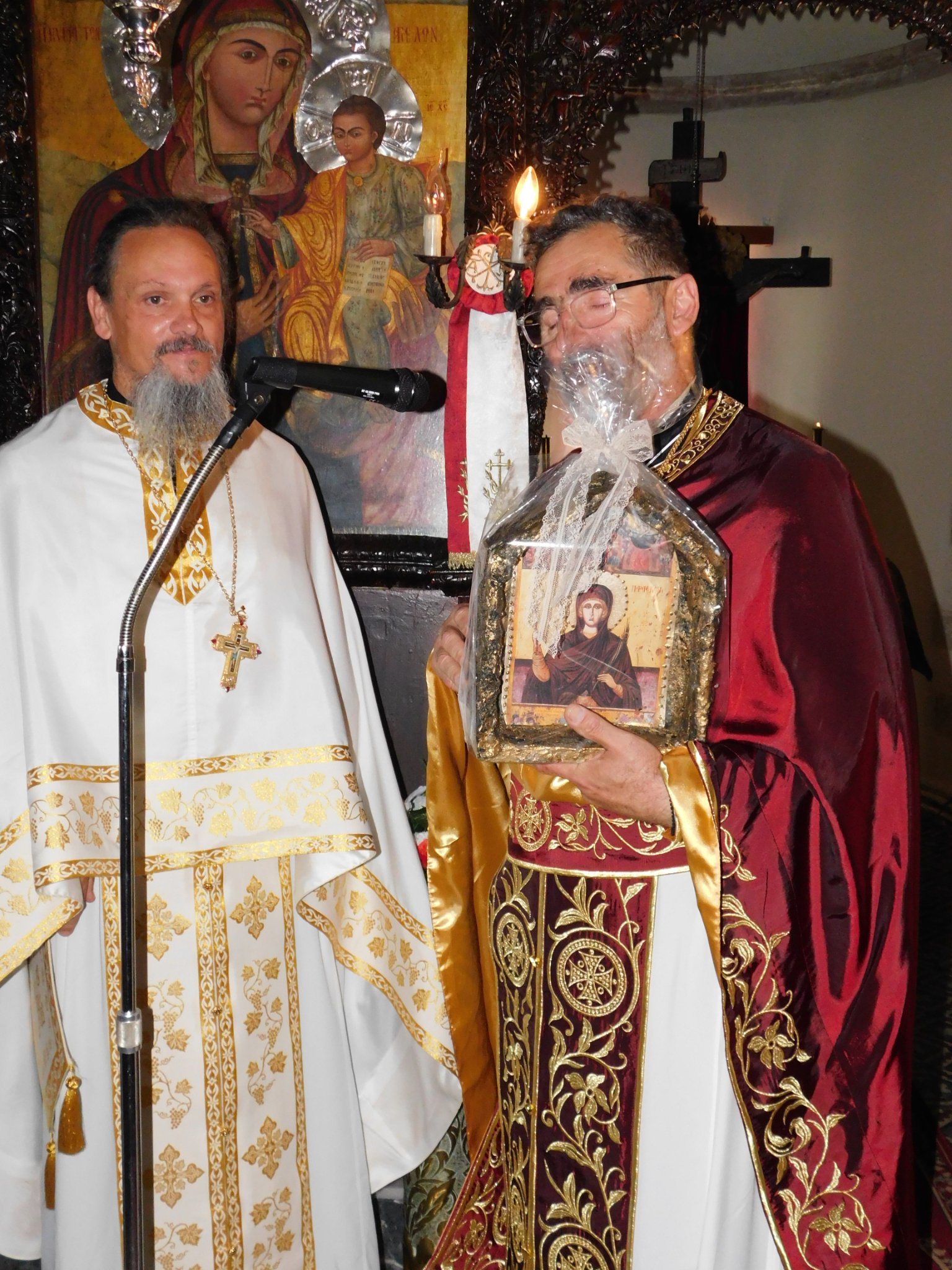 Ο π. Επιφάνιος ευχαρίστησε τον εφημέριο και καλό του φίλο για την υποδοχή και τη φιλοξενία και πρόσφερε εκ μέρους των προσκυνητών μία εικόνα της Παναγίας και παραδοσιακά γλυκίσματα..