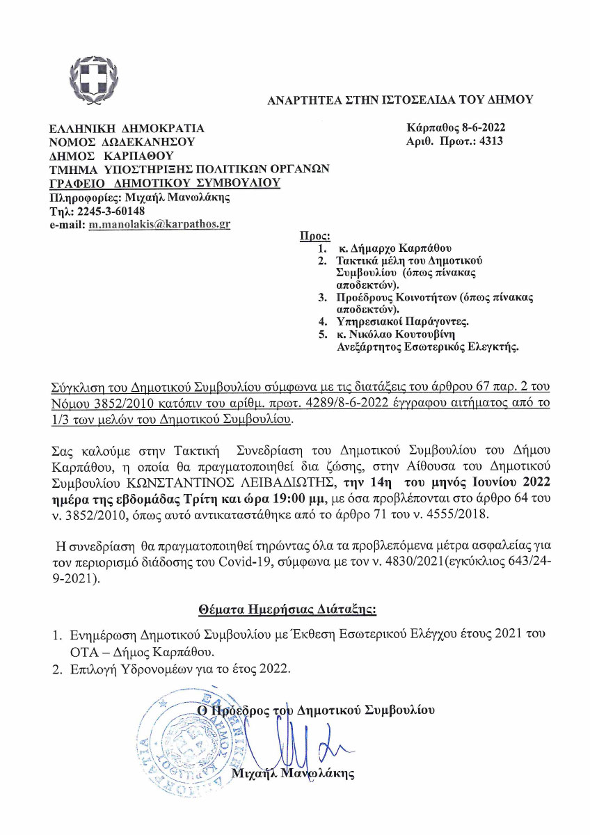 Στις 14 Ιουνίου 2022, ημέρα Τρίτη και ώρα 19 μ.μ. θα παραγματοποιηθεί Τακτική Συνεδρίαση του Δημοτικού Συμβουλίου του Δήμου Καρπάθου στο Δημοτικό Κατάστημα με Θέματα Ημερήσιας Διάταξης:
