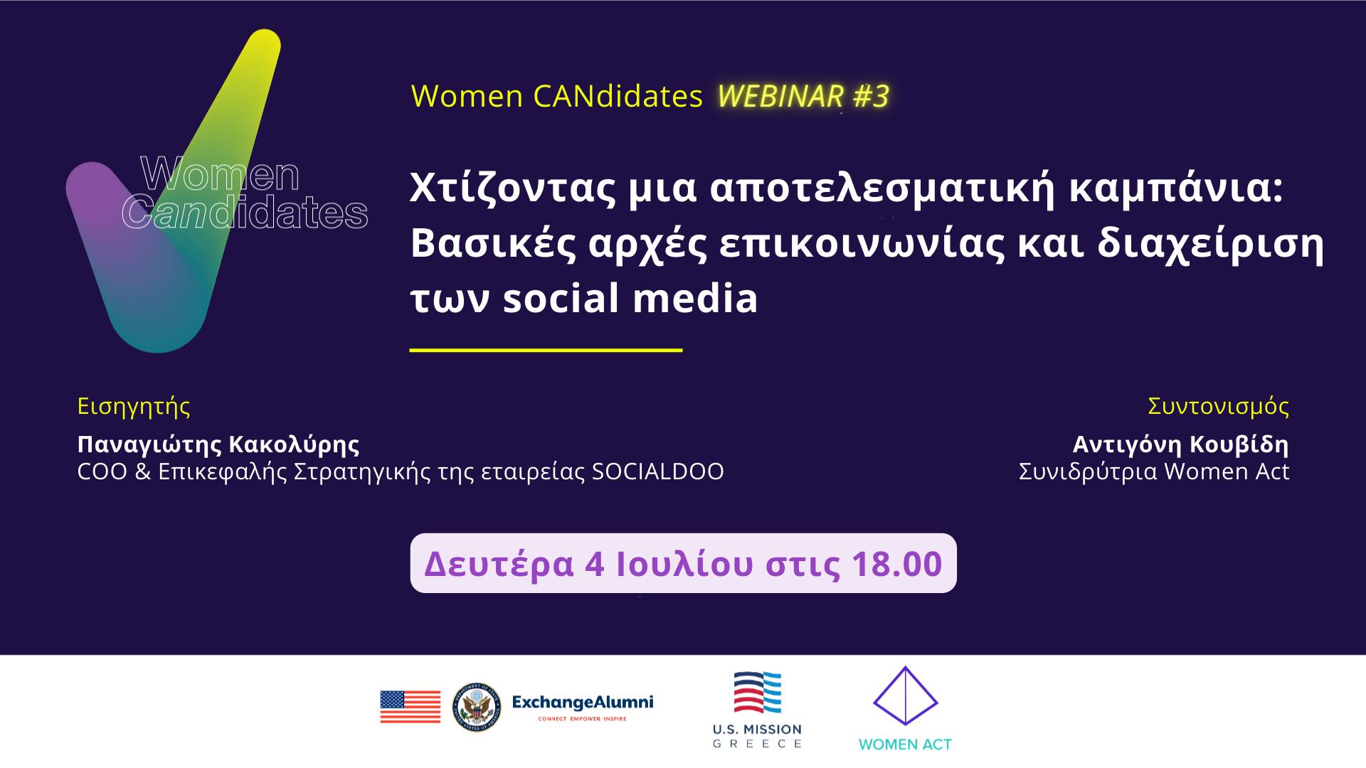 Το 3o webinar της διαδικτυακής πλατφόρμας womencandidates.gr που υλοποιείται από τη Women Act, με την πολύτιμη στήριξη και χρηματοδότηση της Πρεσβείας των Η.Π.Α. στην Ελλάδα, θα πραγματοποιηθεί τη Δευτέρα 4/7 στις 18.00 με θέμα: Χτίζοντας μια Αποτελεσματική Καμπάνια: Bασικές Αρχές Επικοινωνίας & Διαχείριση των Social Media.