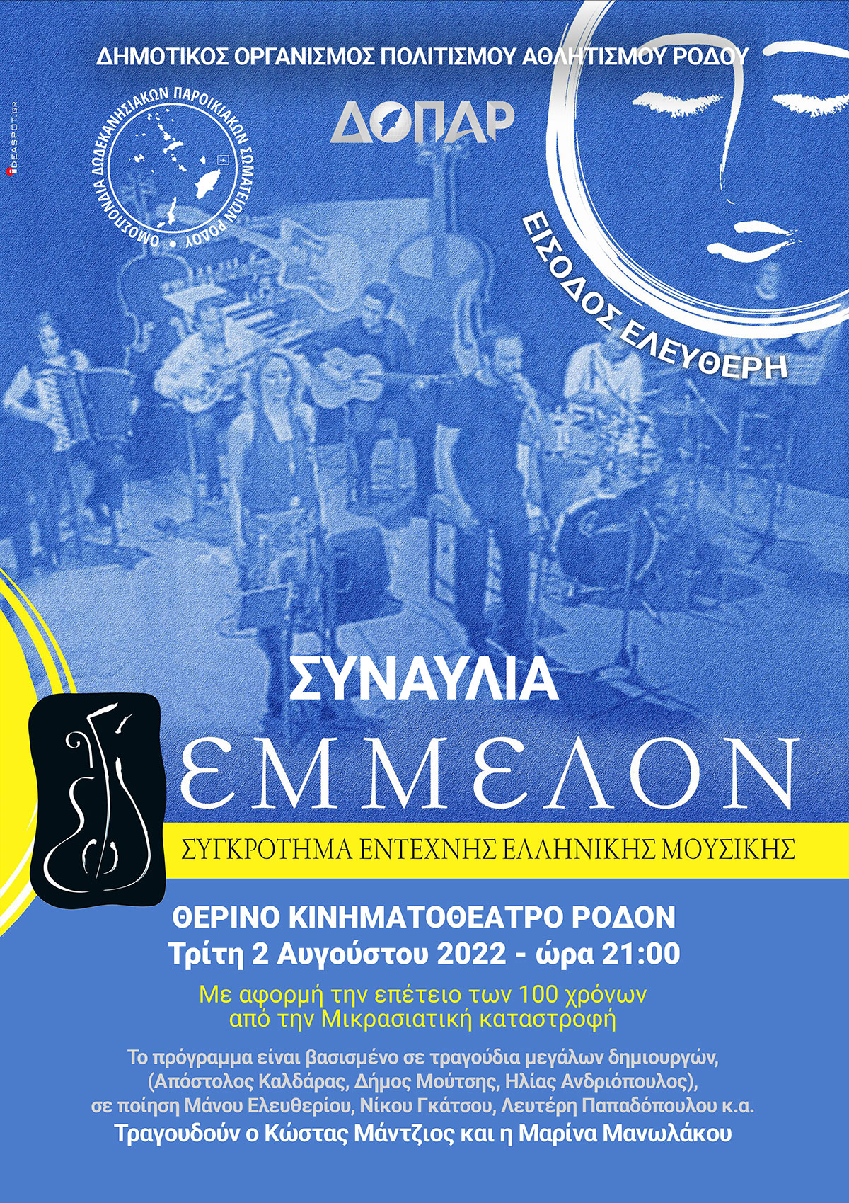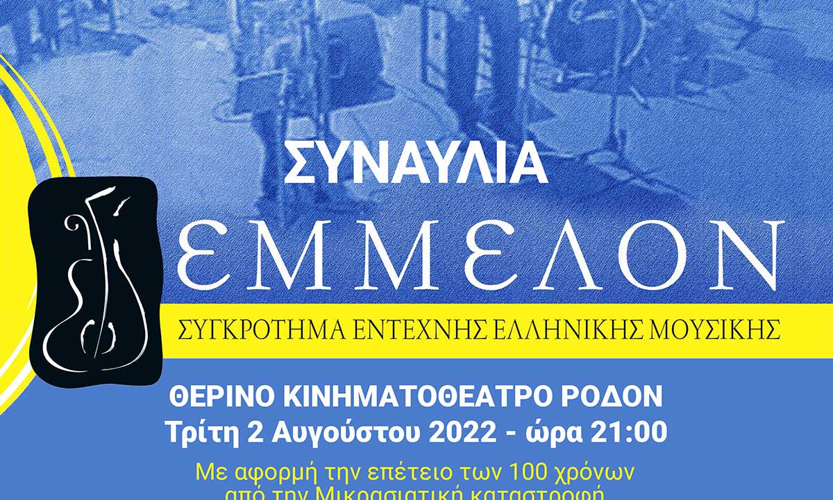 Το συγκρότημα Έντεχνης Ελληνικής Μουσικής ΕΜΜΕΛΟΝ έχοντας δώσει πολλές παραστάσεις σε Ελλάδα και εξωτερικό, πραγματοποιεί συναυλία με αφορμή την επέτειο των 100 χρόνων από την Μικρασιατική καταστροφή, στο Δημοτικό Θέατρο ΡΟΔΟΝ, την Τρίτη 2 Αυγούστου 2022 και ώρα 21:00.