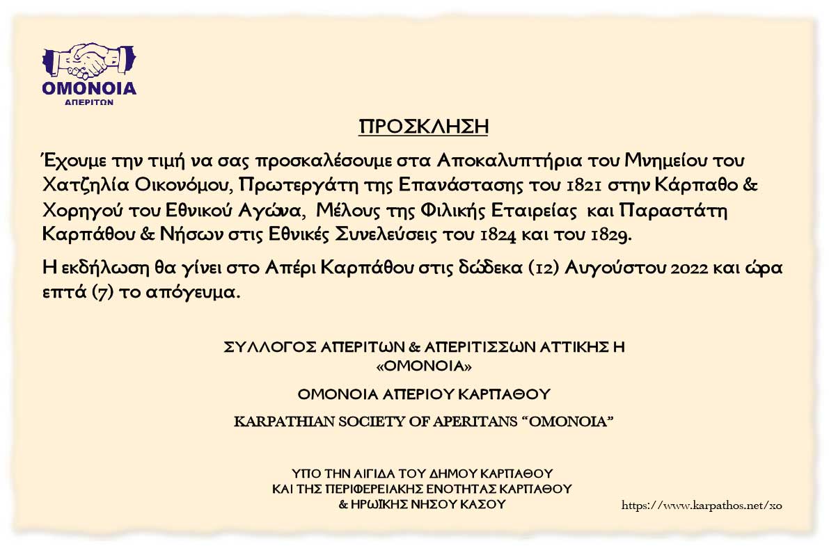 Έχουμε την τιμή να σας προσκαλέσουμε στα Αποκαλυπτήρια του Μνημείου του Χατζηλία Οικονόμου, Πρωτεργάτη της Επανάστασης του 1821 στην Κάρπαθο & Χορηγού του Εθνικού Αγώνα, Μέλους της Φιλικής Εταιρείας και Παραστάτη Καρπάθου & Νήσων στις Εθνικές Συνελεύσεις του 1824 και του 1829.