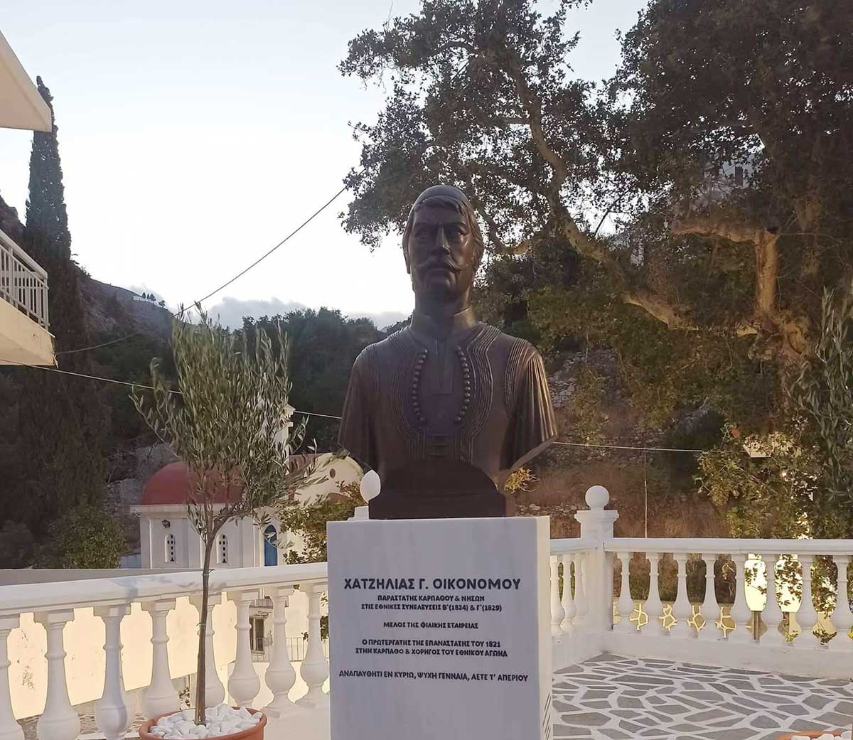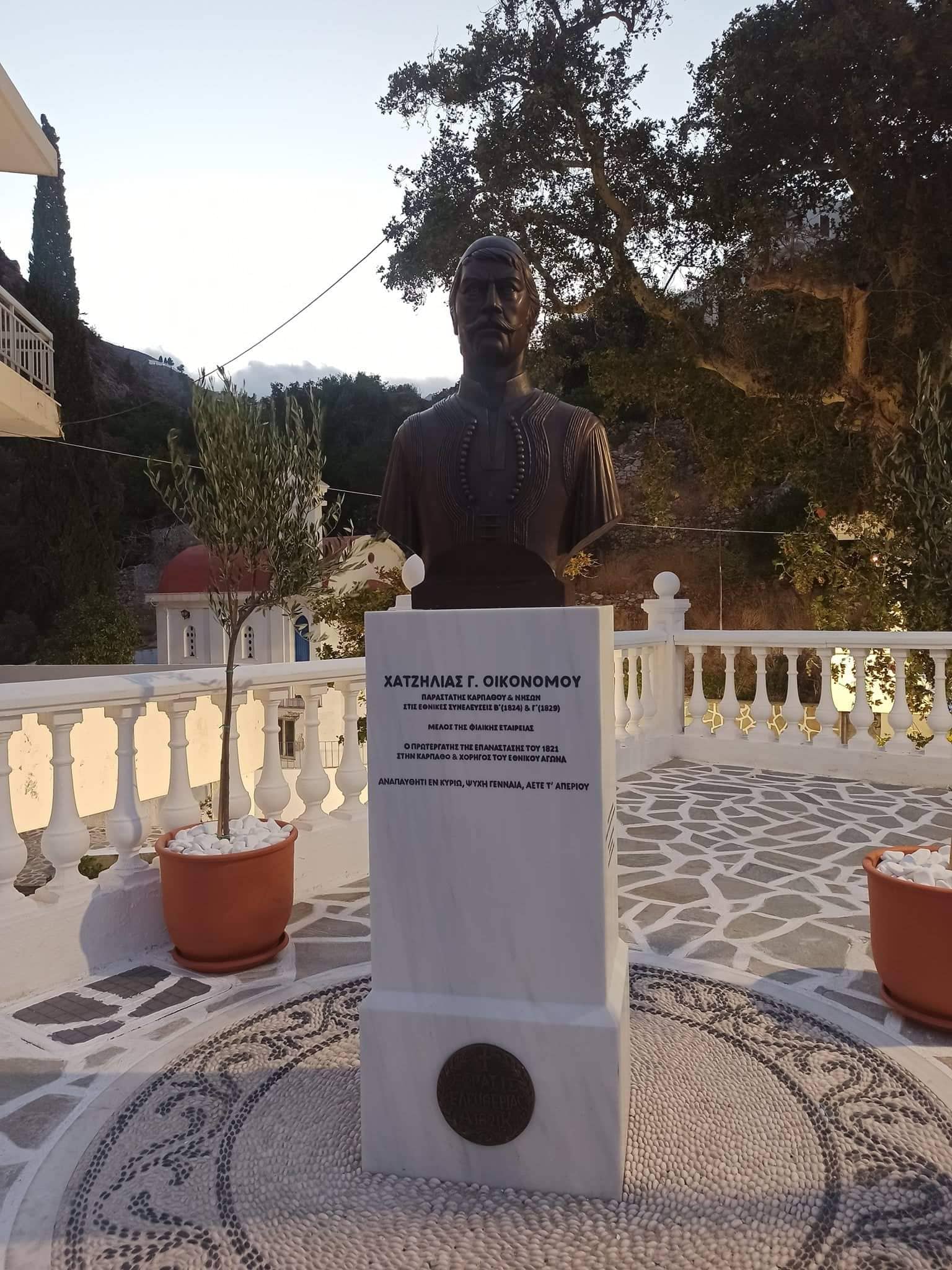 Ο Επαναστάτης Χατζηλίας, ο μορφωμένος λόγιος, ο Παραστάτης της Καρπάθου στις πρώτες Εθνοσυνελεύσεις, ο Φιλικός, ο χρηματοδότης του Αγώνα, ο αντισυμβατικός, ο ορμητικός και συνάμα φλογερός αγωνιστής, ο (κατά τον μητροπολίτη Νεόφυτο) “αντίθεος και αποστάτης της Ορθοδοξίας”, κοσμεί πλέον το κέντρο του χωριού.