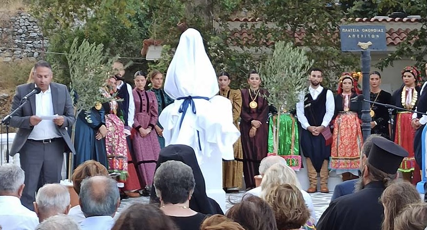 ε) Η αγαστή συνεργασία με Αρχές, τοπικούς φορείς και εθελοντές ιδιώτες, κατά τη διάρκεια της προετοιμασίας του μνημείου και του χώρου πέριξ του μνημείου, στον δρόμο προς την 12η Αυγούστου. Επιπρόσθετα, με πρωτοβουλία του κοινοτάρχη Απερίου, Γιώργου Παππά, επανατοποθετήθηκε-ευελπιστούμε για τελευταία φορά μετά τις μυστηριώδεις προηγούμενες εξαφανίσεις της- η ταμπέλα της “Οδού Χατζηλίας Οικονόμου” στο κέντρο του χωριού.