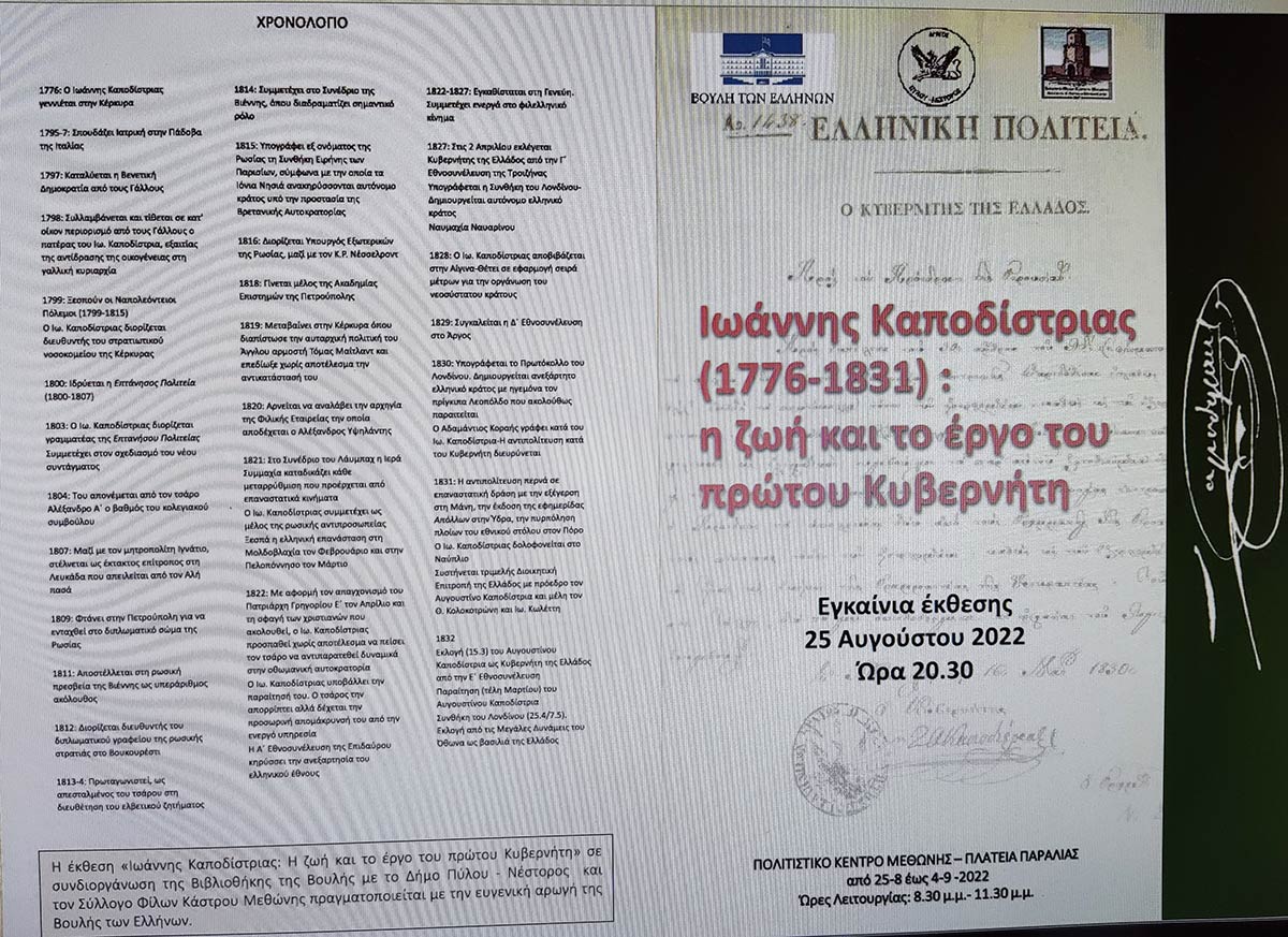Η έκθεση διοργανώνεται από τη Βιβλιοθήκη της Βουλής, σε συνεργασία με τον Δήμο Πύλου-Νέστορος και τον Σύλλογο Φίλων Κάστρου Μεθώνης και ακολουθεί το αφήγημα της έκθεσης της Βουλής των Ελλήνων “Ιωάννης Καποδίστριας: Η πορεία του στον χρόνο”, που εγκαινιάστηκε στο Μέγαρο του Κοινοβουλίου τον Νοέμβριο του 2016.