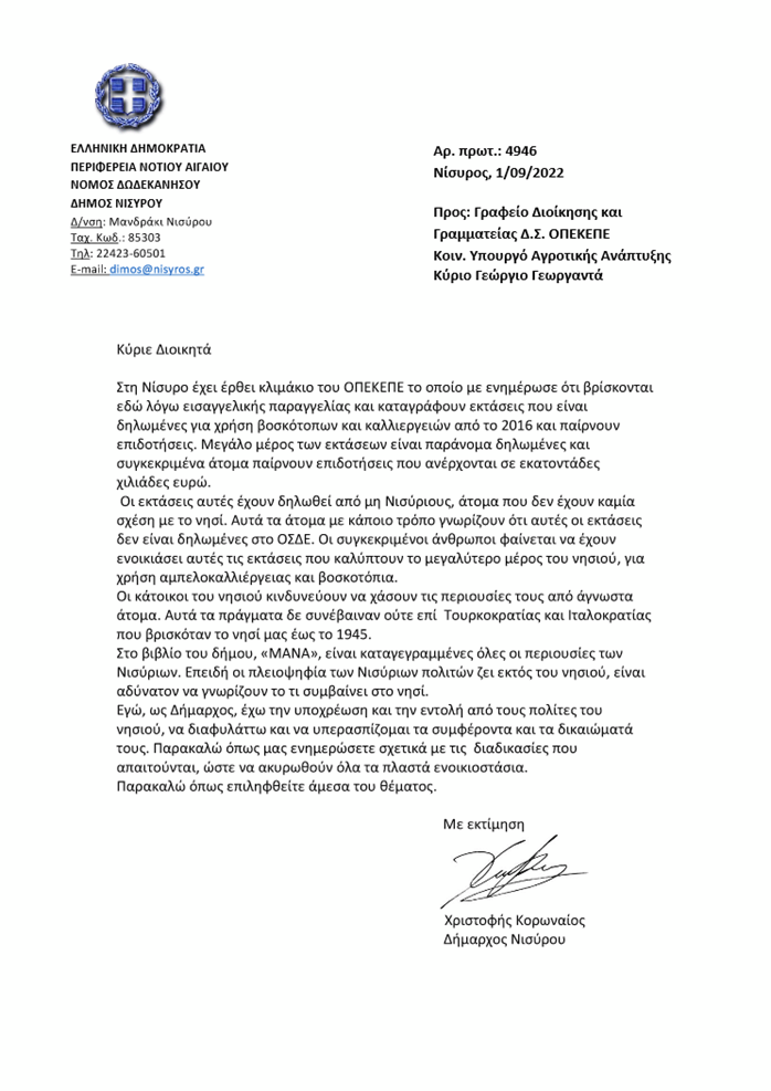 Ακολουθεί την επιστολή του δημάρχου Νισύρου κ. Χριστοφή Κορωναίου στον ΟΠΕΚΕΠΕ και στον Υπουργό Αγροτικής ανάπτυξης.