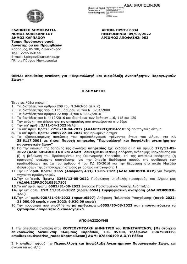 Ο Δήμος Καρπάθου αποφάσισε την απευθείας ανάθεση στον ΚΟΥΓΙΟΥΜΑΤΖΑΚΗ ΔΗΜΗΤΡΙΟ ΤΟΥ ΚΩΝΣΤΑΝΤΙΝΟΥ ( με στοιχεία επικοινωνίας Διεύνθυση Όλυμπος Καρπάθου, ΤΚ 85700 ΤΗΛ. 6947988329 email executivedrive _rodos@hotmail.com) AΦΜ: 078446199 Δ.Ο.Υ: Ρόδου.