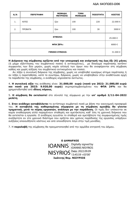 Η συνολική αξία της ανάθεσης είναι 31.000 ευρώ. Για το 2022: 21.080,00 ευρώ και για το 2023: 9.920.00 ευρώ.