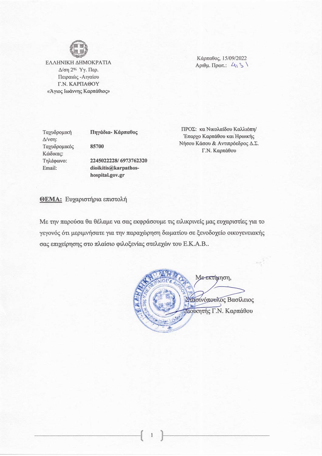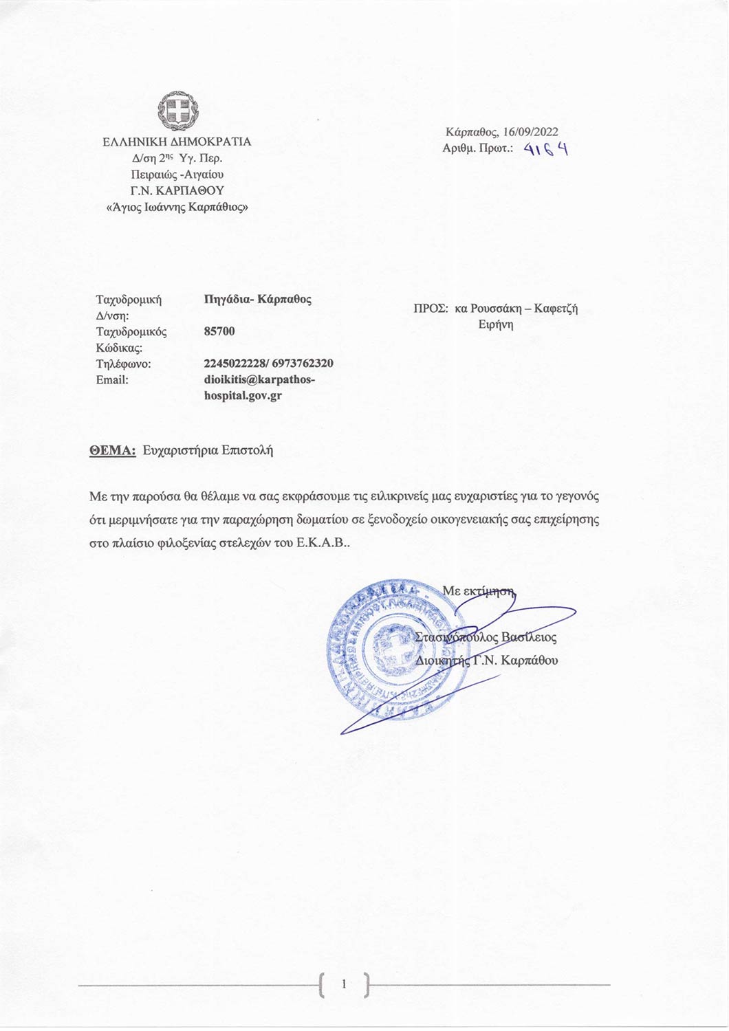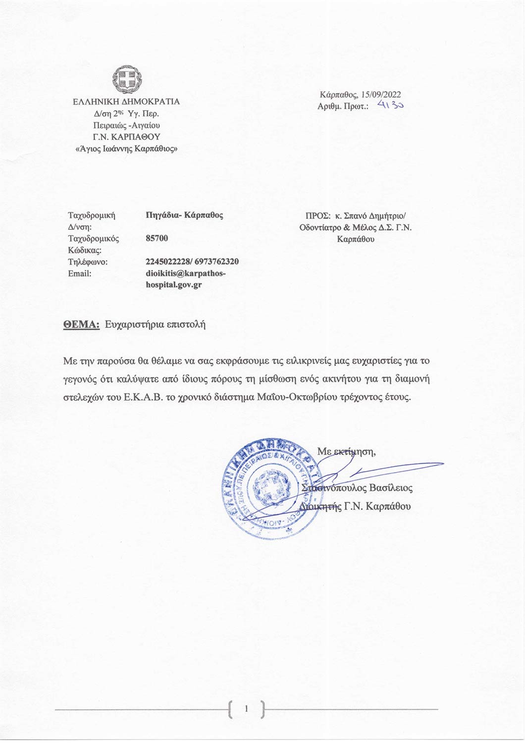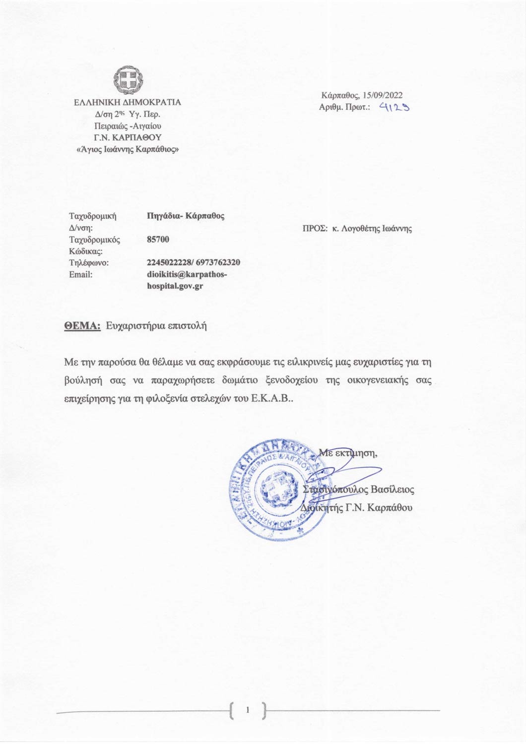 Ο διοικητής του Γενικού Νοσοκομείου Καρπαθου Βασίλης Στασινόπουλος ευχαριστεί τους κ.κ.: