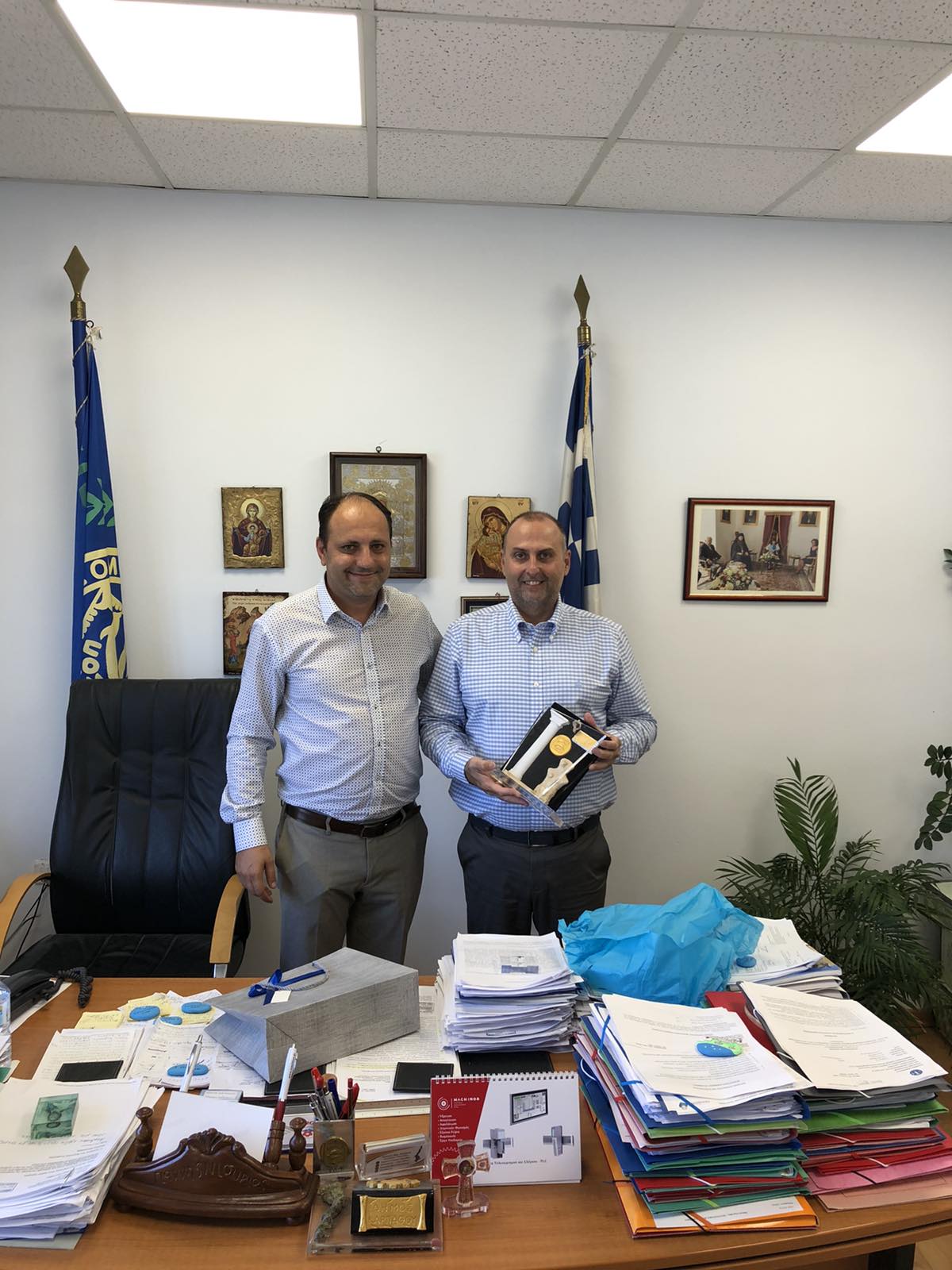 Κλείνοντας την σχεδόν δίωρη συνάντηση εργασίας, παραδόθηκε εκ μέρους του Δημάρχου και του λαού της Καρπάθου στον κ. Καραγιάννη αναμνηστικό δώρο με την κυρά της Καρπάθου και το λογότυπο του Δήμου μας.