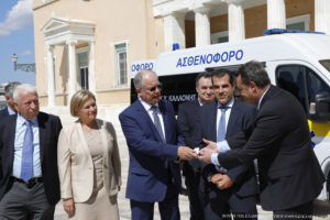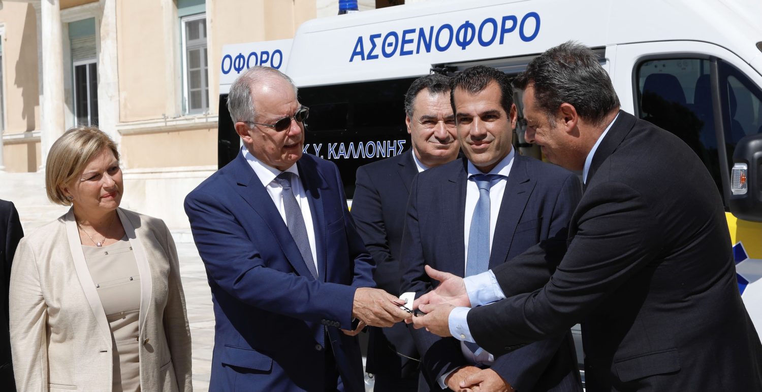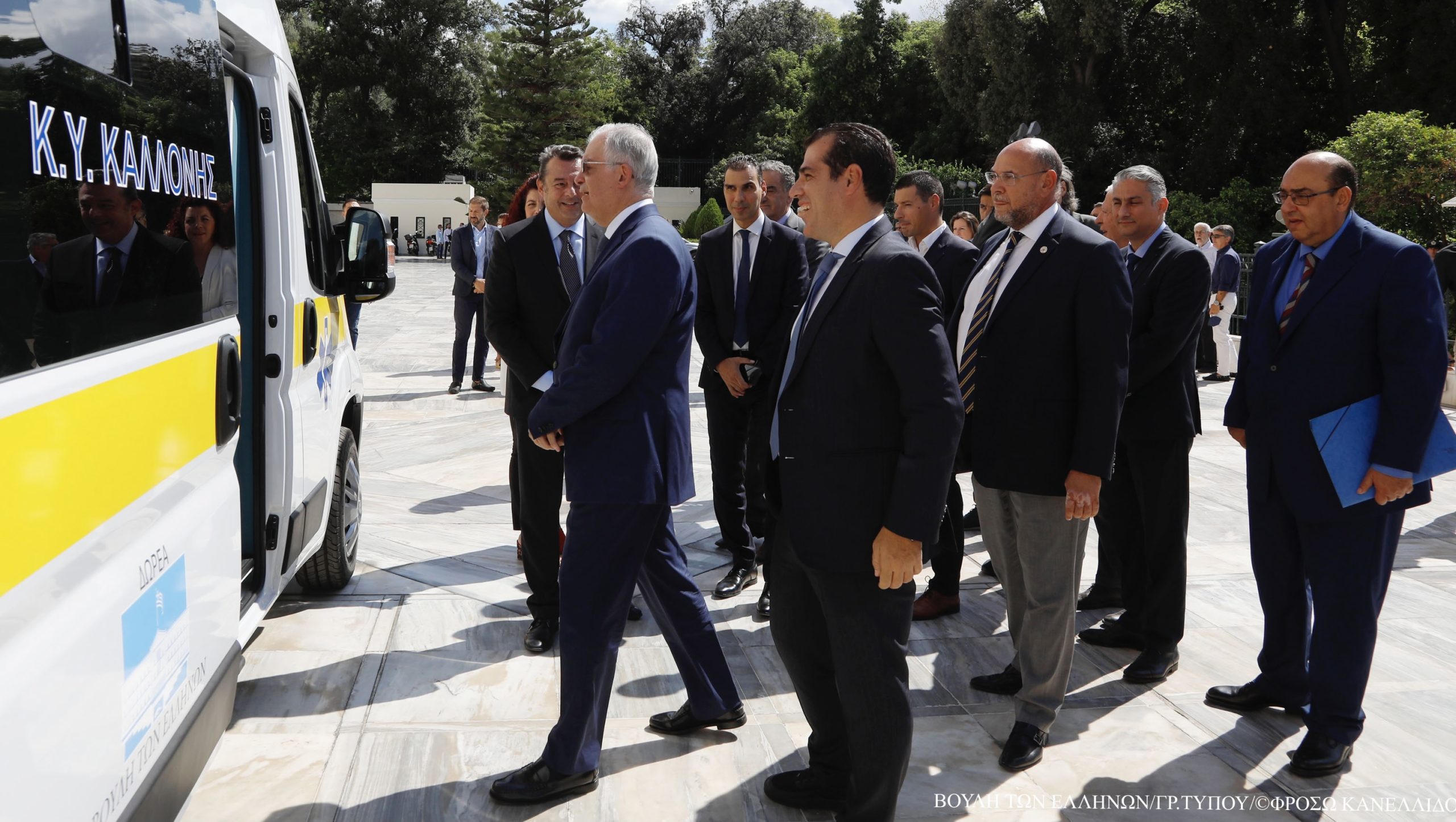 Στον προαύλιο χώρο του Ελληνικού Κοινοβουλίου πραγματοποιήθηκε σήμερα η τελετή δωρεάς ενός σύγχρονου, πλήρως εξοπλισμένου ασθενοφόρου οχήματος, με προδιαγραφές κίνησης σε δύσβατους δρόμους, προς το Κέντρο Υγείας Καλλονής της νήσου Λέσβου.