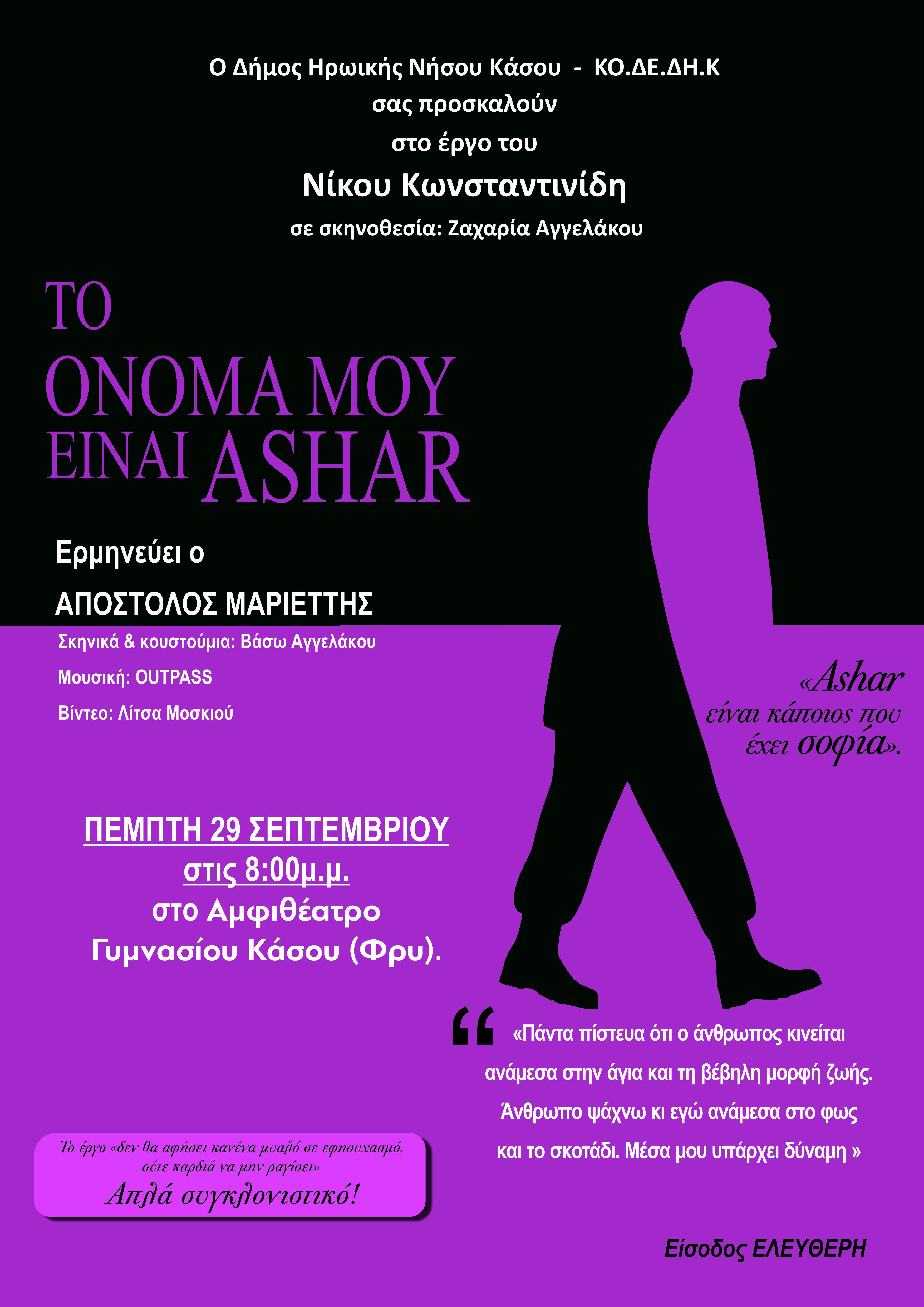 α) Την Πέμπτη 29/9/2022 08:00 μ.μ. στο αμφιθέατρο Γυμνασίου Κάσου (Φρυ), στη θεατρική παράσταση του Θεάτρου Νοτίου Αιγαίου: «ΤΟ ΟΝΟΜΑ ΜΟΥ ΕΙΝΑΙ ASHAR» του Νίκου Κωνσταντινίδη, σε σκηνοθεσία Ζαχαρία Αγγελάκου, φωτισμό και κουστούμια Βάσω Αγγελάκου, μουσική OUTPASS, video Λίτσα Μοσκή.