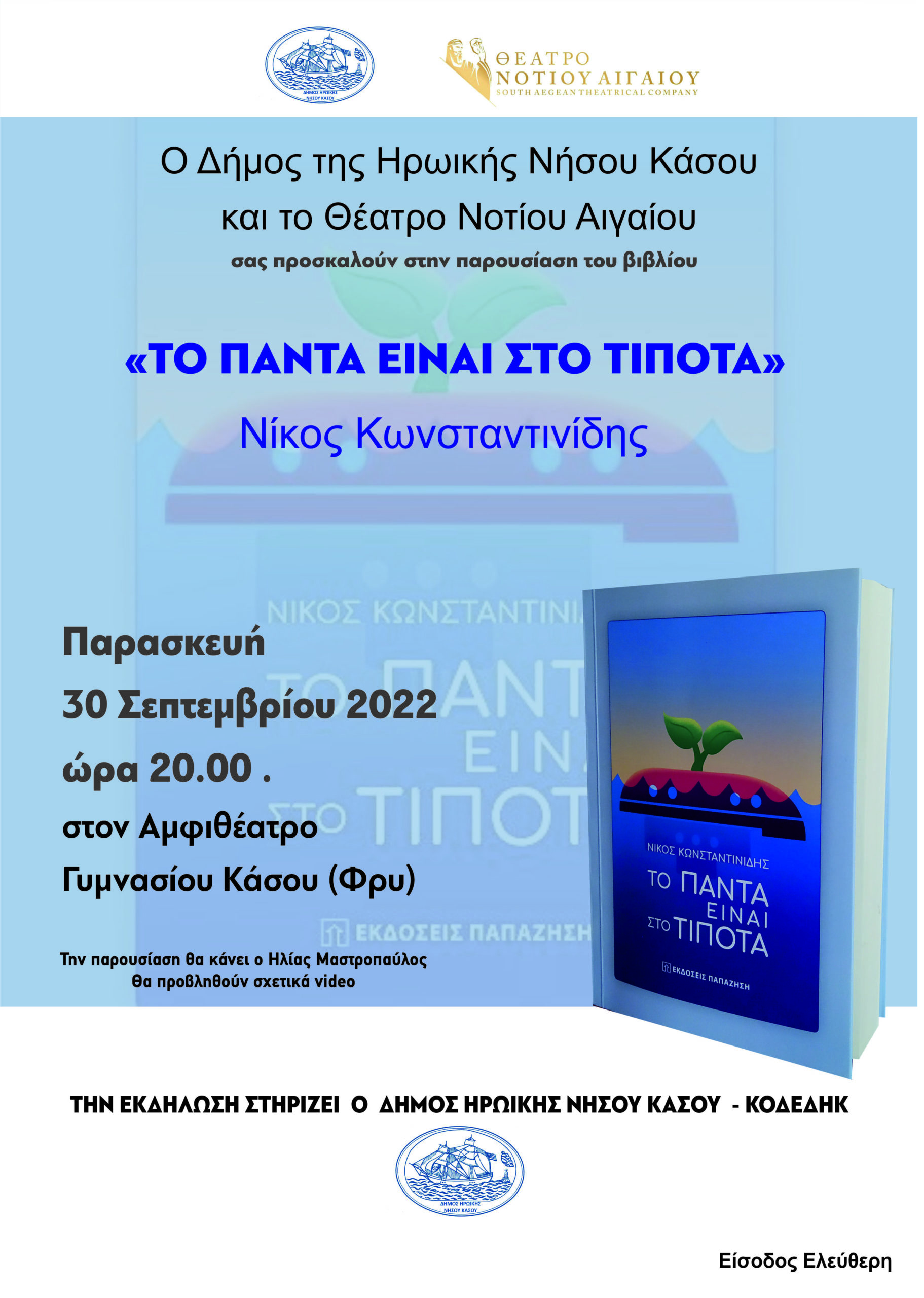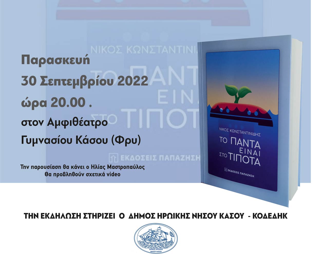 β) Την Παρασκευή 30/9/2022 08:00 μ.μ. στο αμφιθέατρο Γυμνασίου Κάσου (Φρυ), στη παρουσίαση του βιβλίου «ΤΟ ΠΑΝΤΑ ΕΙΝΑΙ ΣΤΟ ΤΙΠΟΤΑ» του Νίκου Κωνσταντινίδη (εκδόσεις Παπαζήση), το οποίο αναφέρεται στην Ηρωική Νήσο Κάσο.