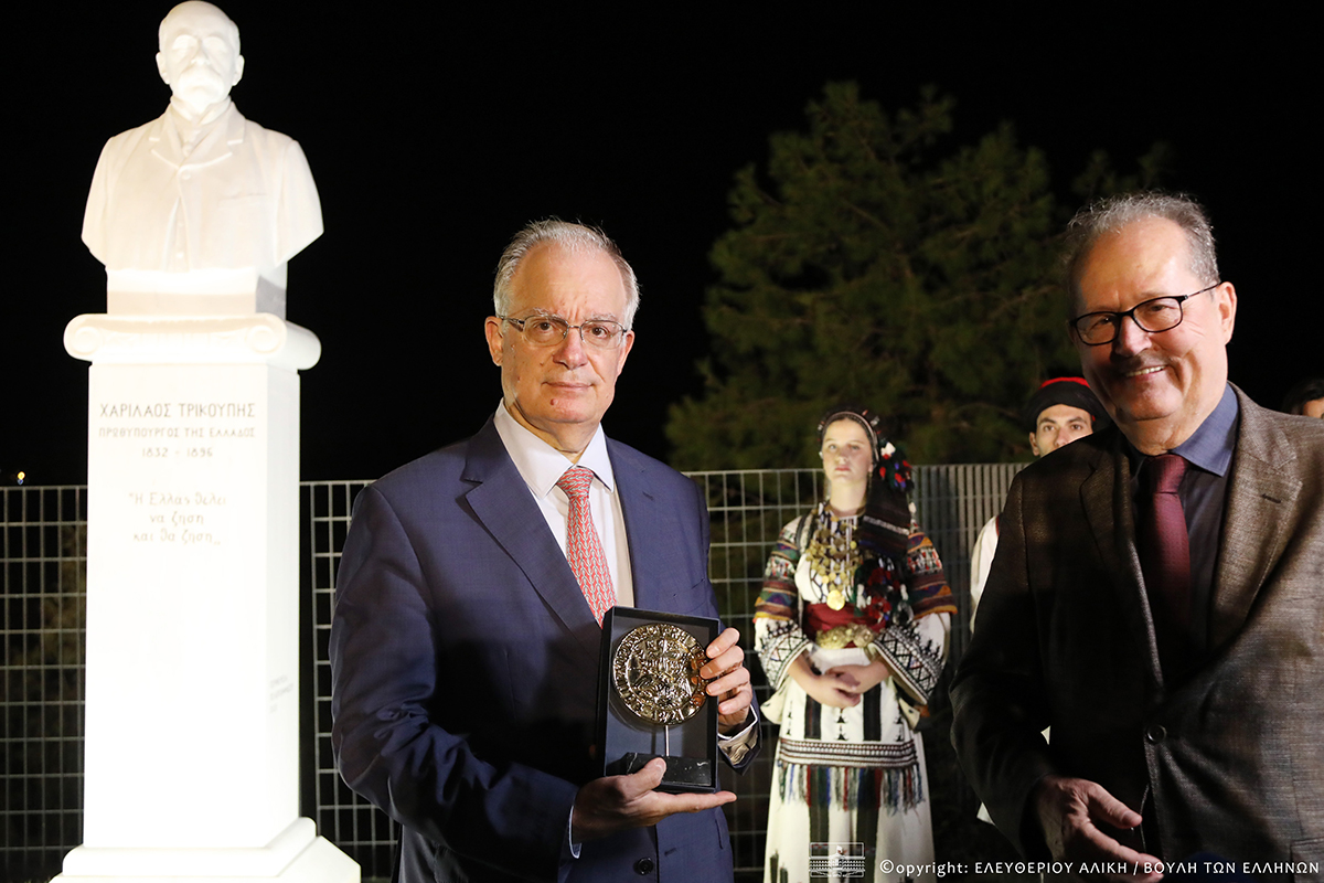 Κεντρικός ομιλητής στην εκδήλωση ήταν ο Πρόεδρος της Βουλής ο κ. Κωνσταντίνος Τασούλας, ο οποίος ανέλυσε τα πολιτικά, οικονομικά και αναπτυξιακά επιτεύγματα του Χαρίλαου Τρικούπη: «Ο Τρικούπης μεταμόρφωσε όλη αυτή τη δυστοκία, όλη αυτή την αποξένωση που υπήρχε στην Ελλάδα με τα έργα τα οποία άφησε. Ένα τρίπτυχο ήταν εκείνο το οποίο κυριάρχησε στην πολιτική του σταδιοδρομία, ένα τρίπτυχο το οποίο το δάμασε, το επέλεξε, το κατέκτησε και το υπηρέτησε. Το τρίπτυχο της πολιτειακής ανάπλασης της χώρας, με την αναζωογόνηση του Κοινοβουλευτισμού, του σταθερού και καρποφόρου εξωτερικού προσανατολισμού της χώρας, προς την Δύση και ειδικότερα προς την Μεγάλη Βρετανία και της εσωτερικής ανασυγκρότησης, μέσω της ανασυγκρότησης των συγκοινωνιών, των δημοσίων έργων και κυρίως του στρατεύματος. Αυτό το τρίπτυχο: δημοκρατία, εξωτερική Πολιτική και εσωτερική ανασυγκρότηση ήταν το τρίπτυχο το οποίο όρθωσε την Ελλάδα, η οποία για πρώτη φορά την εποχή του Τρικούπη έβλεπε να γίνονται έργα από το κράτος. Και για πρώτη φορά έβλεπε τον κρατικό Προϋπολογισμό να έχει προβλέψεις και κωδικούς όχι μόνο για τη μισθοδοσία και την εξυπηρέτηση του δημοσίου χρέους, αλλά και για δημόσιες επενδύσεις, οι οποίος απέδωσαν και τις οποίες χάρηκαν οι μετά από αυτόν επόμενες γενιές» τόνισε ο κ. Τασούλας.