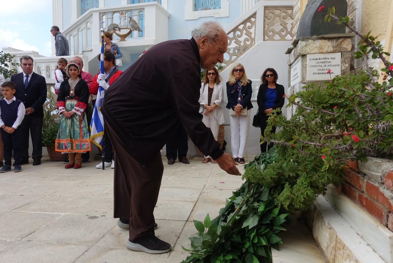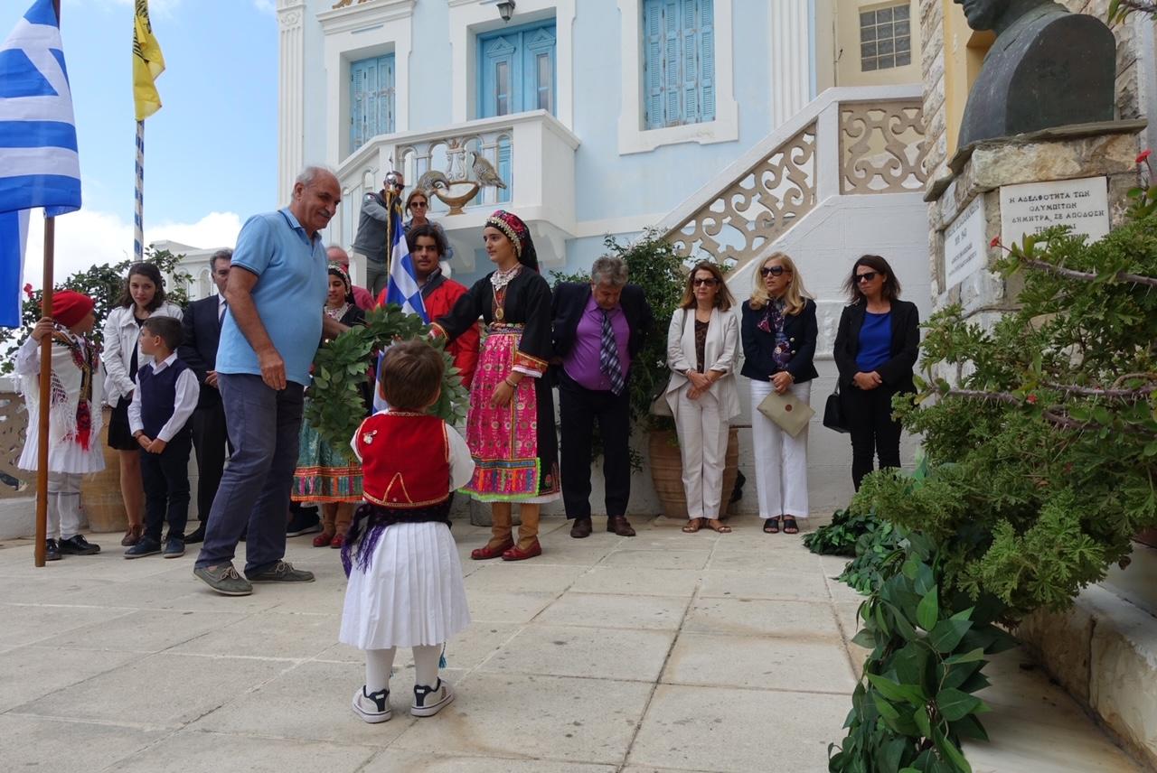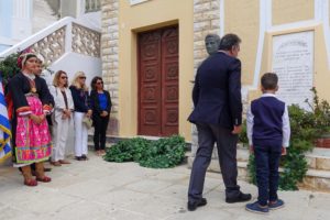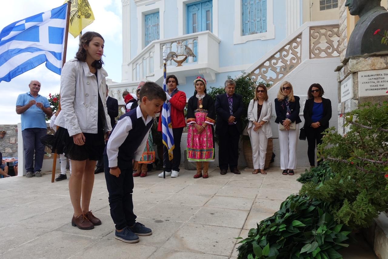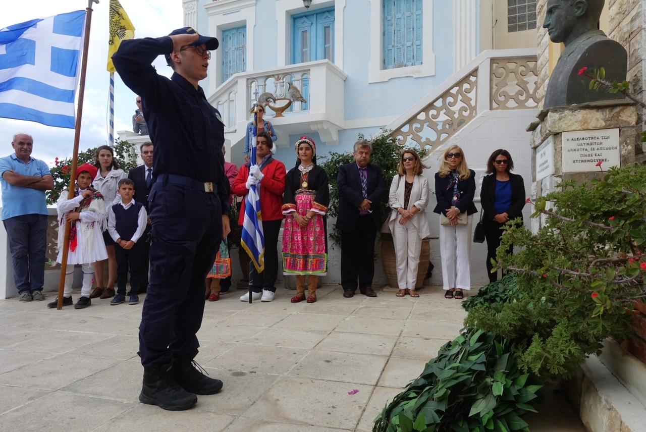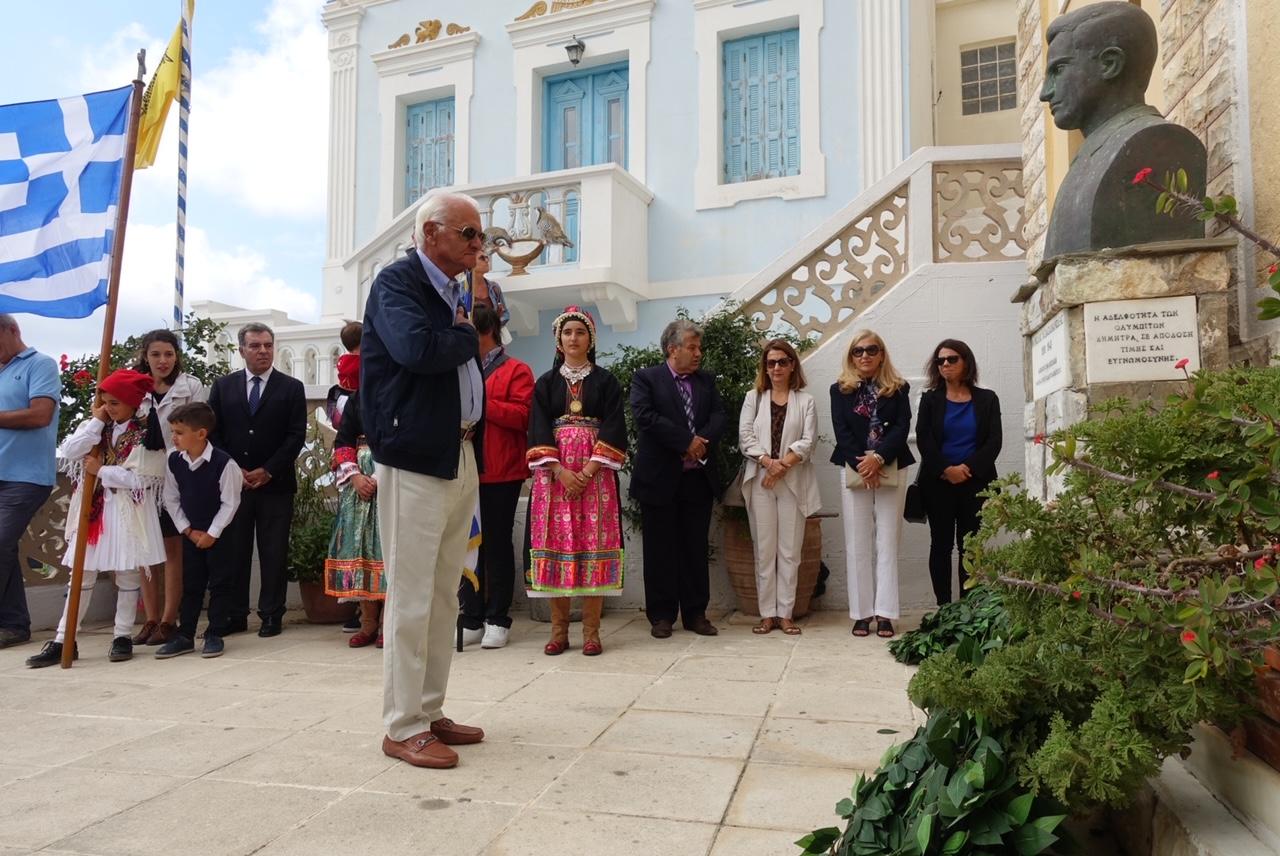 Αμέσως μετά εκφωνήθηκε ο πανηγυρικός της ημέρας από την κεντρική ομιλήτρια καθηγήτρια του Γυμνασίου και των Λυκειακών Τάξεων Ολύμπου Καρπάθου Αλίκη Μανδηλαρά, Δρ Φιλολογίας και εν συνεχεία ο Δημοτικός Σύμβουλος Κομνηνός Γεωρ. Σακέλλης απήγγειλε το συμβολικό ποίημα του Αριστοτέλη Βαλαωρίτη “Ο βράχος και το κύμα“. Ο παπά-Γιάννης Διακογεωργίου απήγγειλε με τη σειρά του καλοταιριασμένες μαντινάδες που έγραψε ειδικά για την επετειακή εκδήλωση.