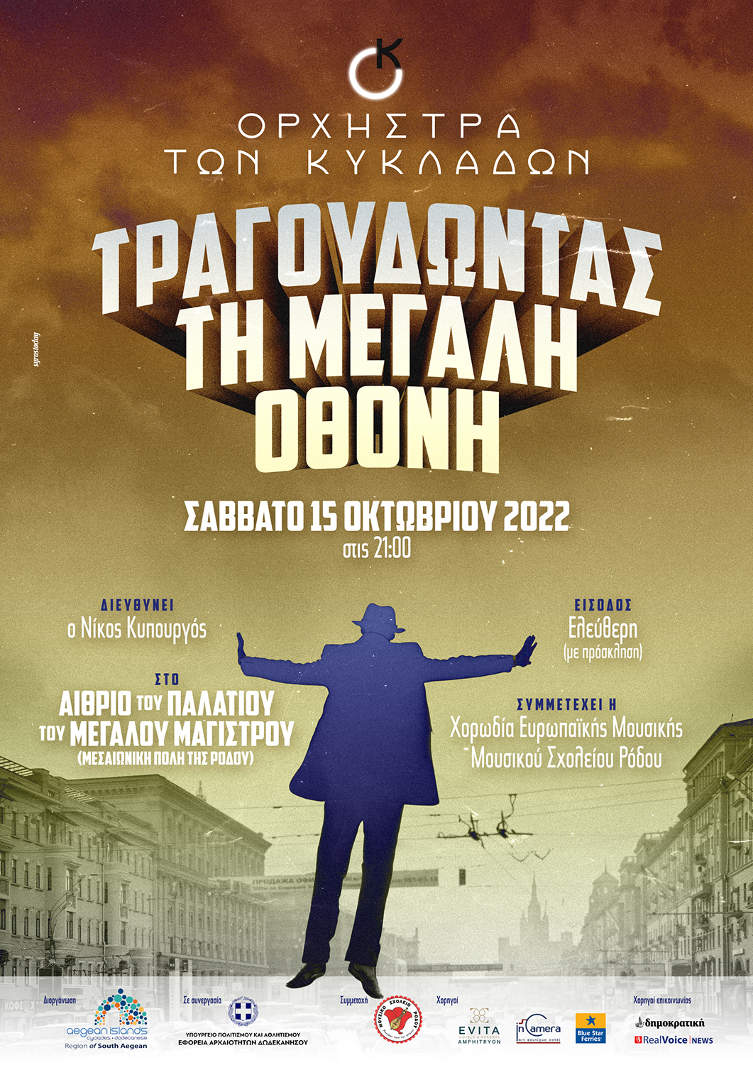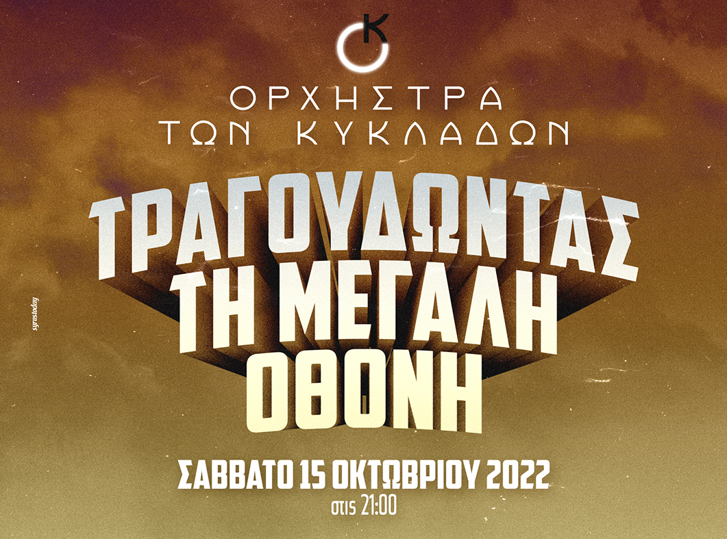Η Περιφέρεια Νοτίου Αιγαίου και η Ορχήστρα των Κυκλάδων, σας προσκαλούν σε μια βραδινή βόλτα στον κόσμο του κινηματογράφου. Στη συναυλία με θέμα «Τραγουδώντας τη Μεγάλη Οθόνη», ένα σύνολο 25 μουσικών – τραγουδιστών θα μας θυμίσει μουσικές και τραγούδια από αξέχαστες ταινίες του ελληνικού και παγκόσμιου σινεμά.