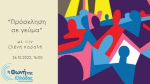 Την Τετάρτη 26 Οκτωβρίου 2022, στις 16:00, η “ΦΩΝΗ ΤΗΣ ΕΛΛΑΔΑΣ” και η εκπομπή “ΠΡΟΣΚΛΗΣΗ ΣΕ ΓΕΥΜΑ” υποδέχονται την ομότιμη καθηγήτρια Κοινωνιολογίας του Πανεπιστημίου Πειραιώς ΕΛΕΝΗ ΝΙΝΑ- ΠΑΖΑΡΖH.