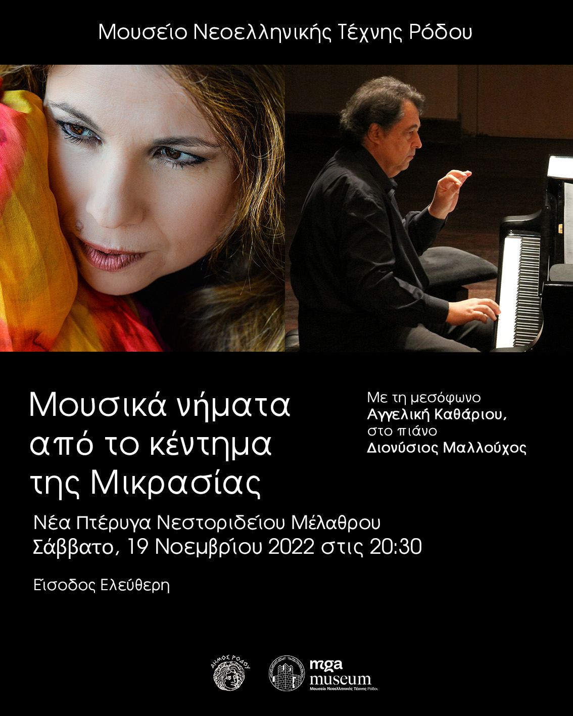 Το Μουσείο Νεοελληνικής Τέχνης Δήμου Ρόδου παρουσιάζει την τρίτη μουσική συνάντηση του Νοεμβρίου με τη συναυλία «Μουσικά νήματα από το κέντημα της Μικρασίας», με την μεσόφωνο Αγγελική Καθάριου και τον πιανίστα Διονύση Μαλλούχο.