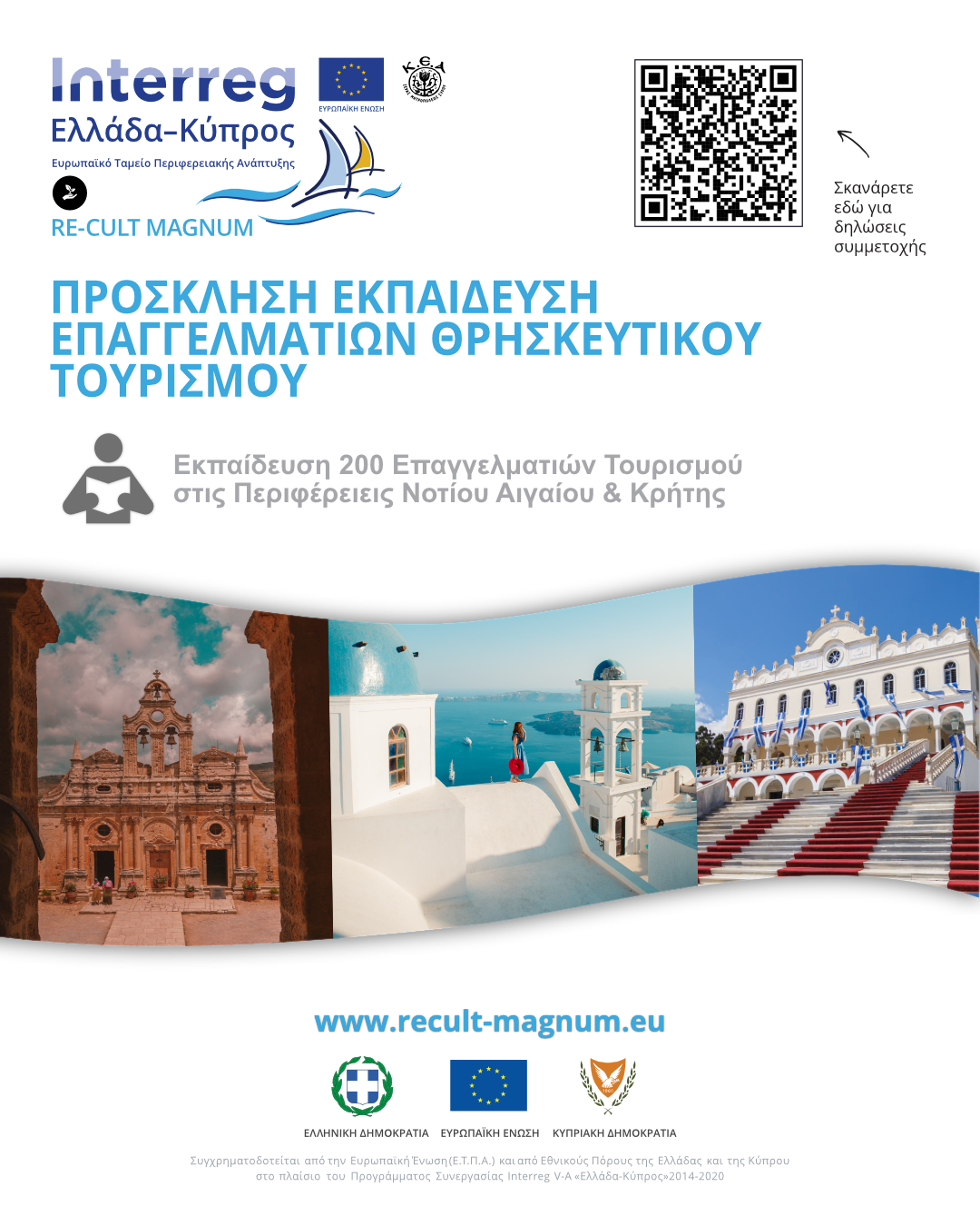 Το ΚΕΑ Ι.Μ. Σύρου προσκαλεί ενδιαφερόμενους επιχειρηματίες και επαγγελματίες τουρισμού να συμμετάσχουν σε δωρεάν δράση εκπαιδευτικών σεμιναρίων, στο πλαίσιο του Έργου «Μεγιστοποίηση του αντικτύπου του Θρησκευτικού Τουρισμού σε Ελλάδα και Κύπρο μέσα από τη στοχευμένη ανάδειξη και διάδοση της πολιτιστικής και θρησκευτικής κληρονομιάς των Εκκλησιών Ελλάδας, Κρήτης και Κύπρου», με ακρωνύμιο «RE-CULT MAGNUM». Το Έργο συγχρηματοδοτείται από την Ευρωπαϊκή Ένωση και από εθνικούς πόρους των χωρών που συμμετέχουν στο Πρόγραμμα Συνεργασίας Interreg V-Α «Ελλάδα-Κύπρος 2014-2020».