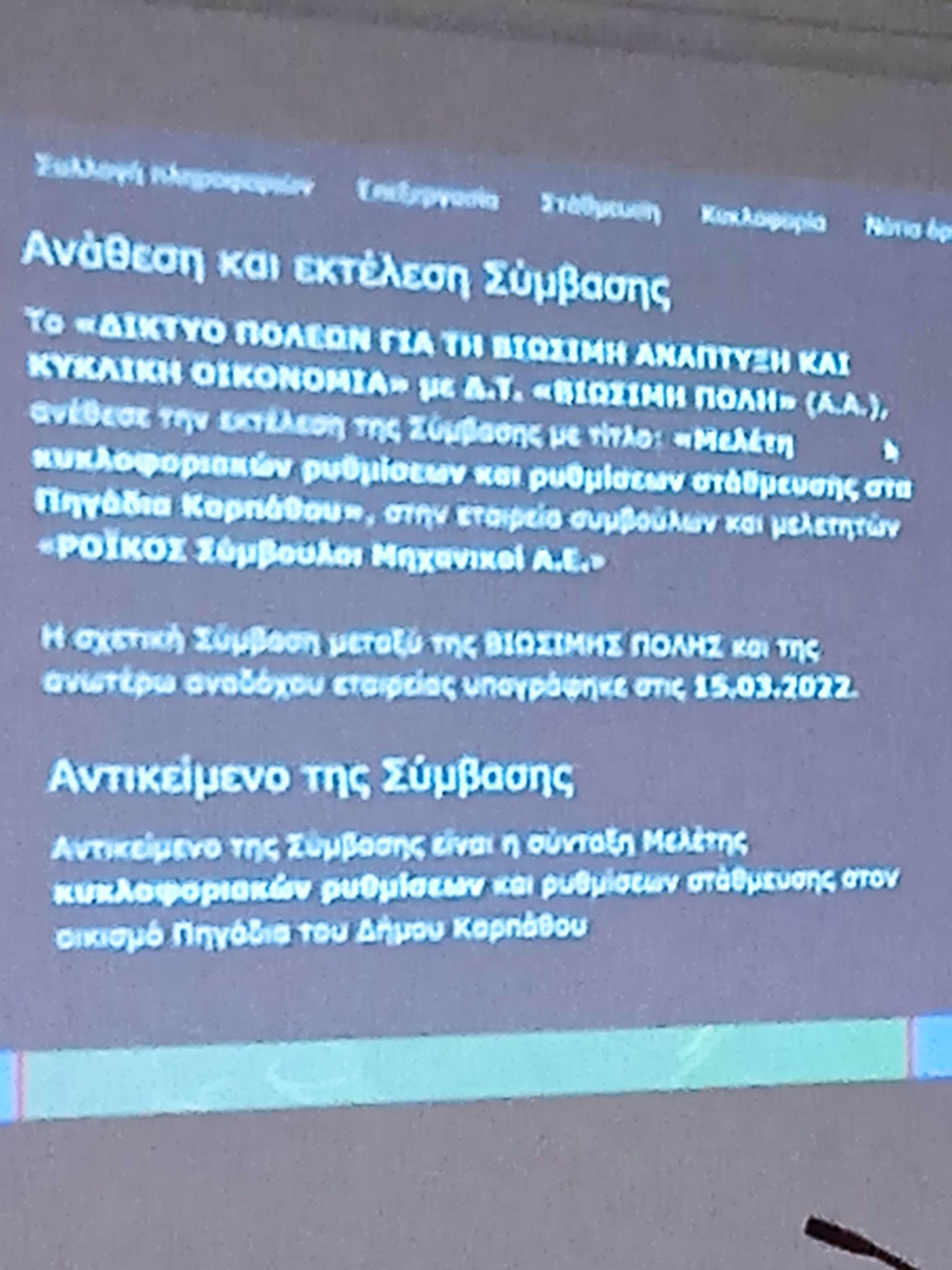 Τη Μελέτη Κυκλοφοριακών Ρυθμίσεων και Ρυθμίσεων Στάθμευσης στα Πηγάδια Καρπάθου παρουσίασε χθες στις 7: 00 μ. μ. στην Αίθουσα Συνεδριάσεων του Δημοτικού Συμβουλίου η ανάδοχος εταιρεία.