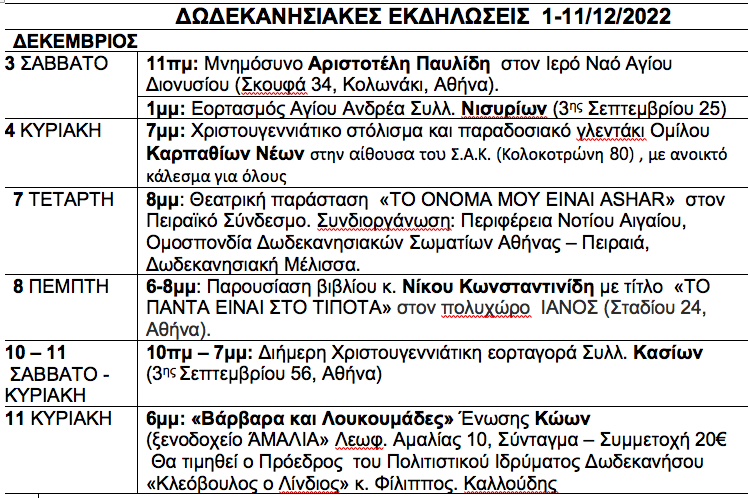 Συνδιοργάνωση: Περιφέρεια Νοτίου Αιγαίου, Ομοσπονδία Δωδεκανησιακών Παροικιακών Σωματίων Αθήνας – Πειραιά, Δωδεκανησιακή Μέλισσα.