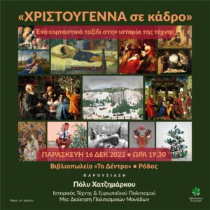 Υ.Γ. Την επόμενη μέρα, 17/12, στις 18:00, στον ίδιο χώρο θα πραγματοποιηθεί αφήγηση χριστουγεννιάτικων παραμυθιών με την Ευαγγελία Γκέλη-Καβαλιέρου.