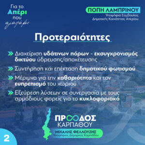 Καθαριότητα, ύδρευση, φωτισμός οι προτεραιότητες μου.