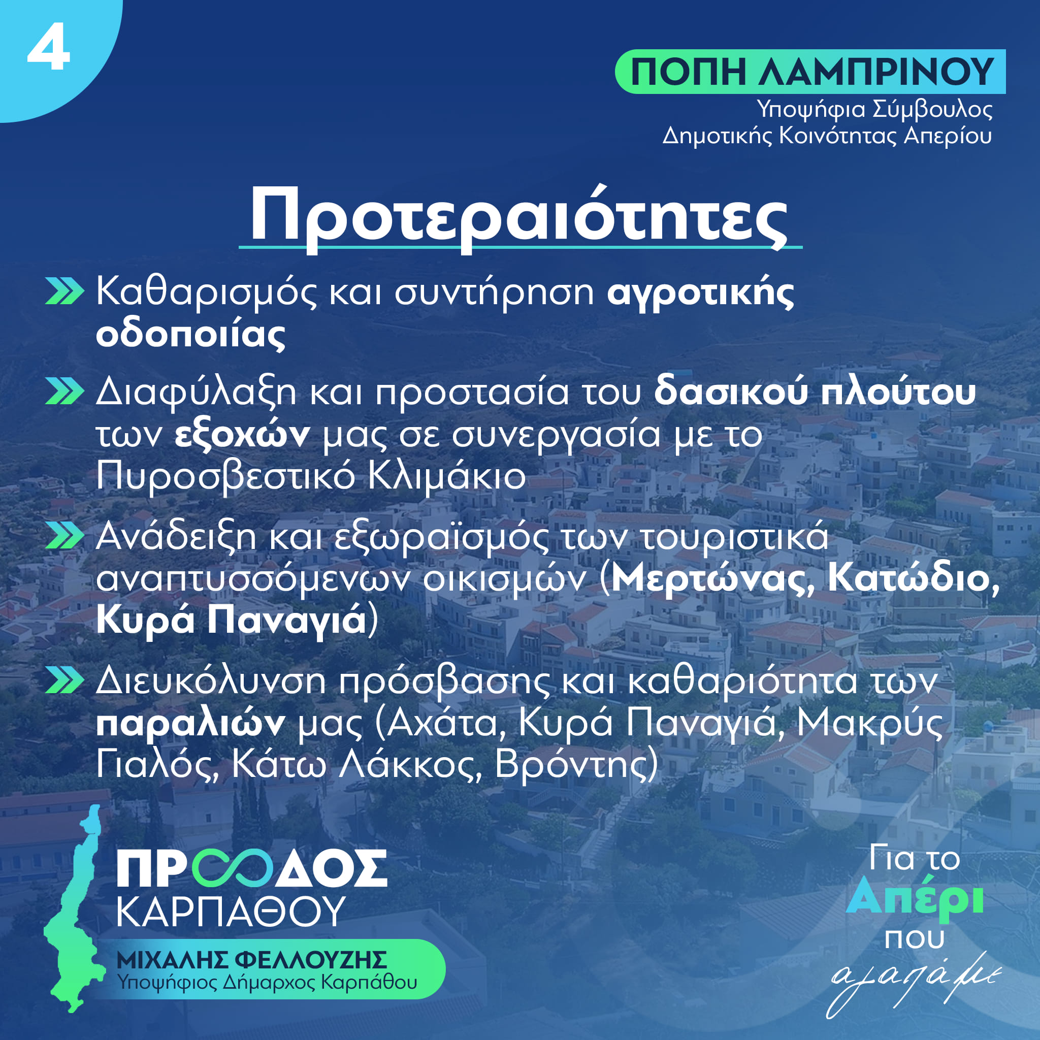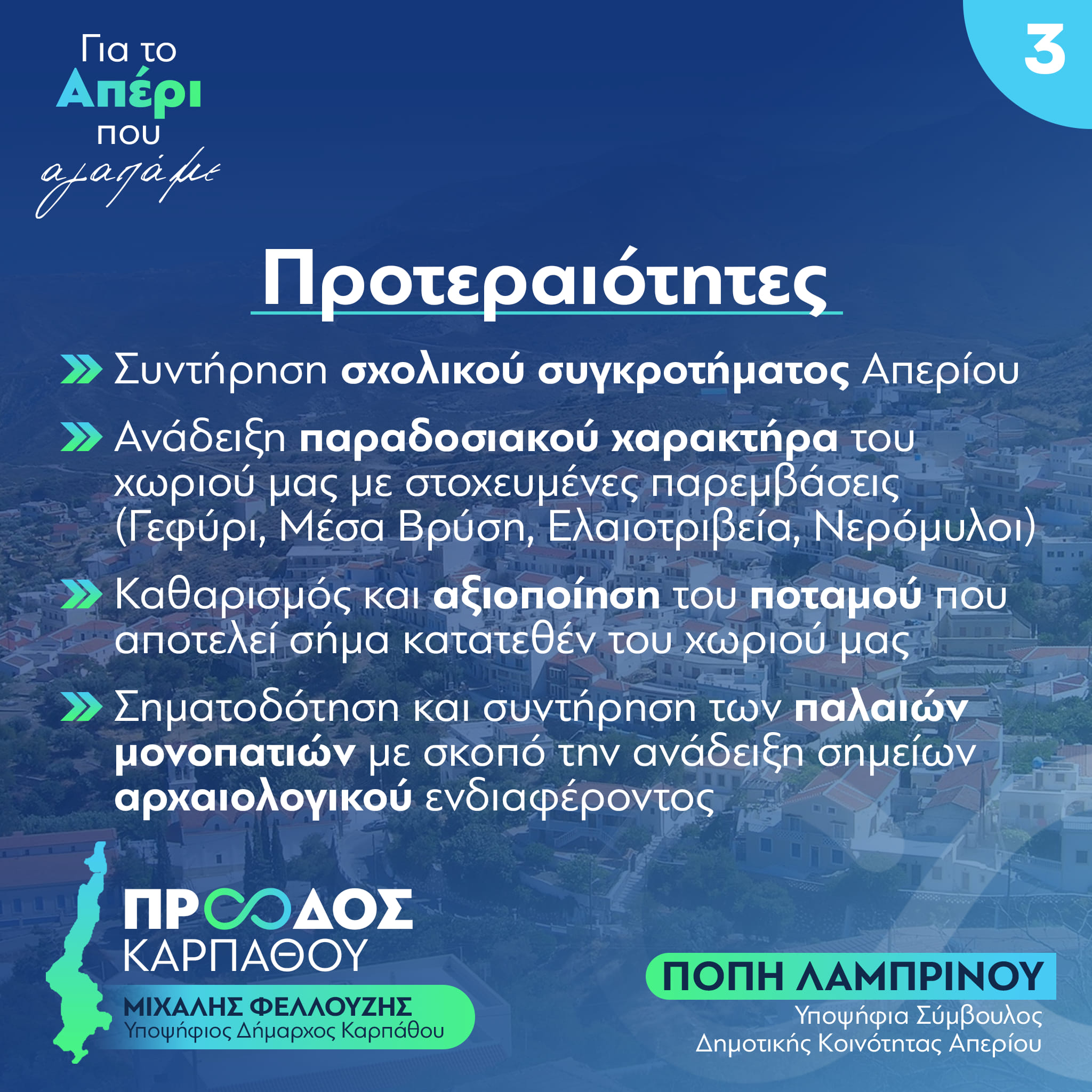 Ζητώ λοιπόν την ψήφο σας για ενα καλύτερο Απέρι, για το Απέρι που θα καταστεί αντάξιο της ιστορίας του.