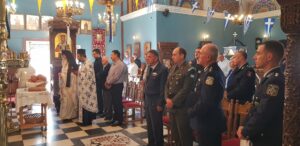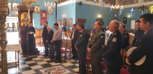 Ακολούθησε Δοξολογία προεξάρχοντος του Πρωτοσυγκέλλου Αρχιμ. Επιφανίου Χριστοδουλάκη, με τη συμμετοχή του Οικονόμου π.Δημητρίου Σκαρβελάκη, Εφημερίου Όθους, του Δημάρχου Καρπάθου, του εκπροσώπου της Επάρχου, του Γενικού Γραμματέα του Δήμου, του Φρουράρχου, του εκπροσώπου της ΔΑΝ Καρπάθου, του Λιμενάρχη, του Διοικητή του Πυροσβεστικού Σώματος, άλλων στρατιωτικών και ευσεβών Χριστιανών.