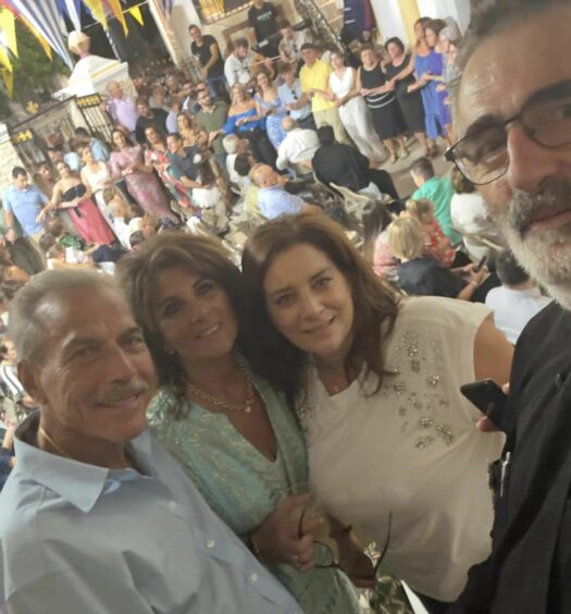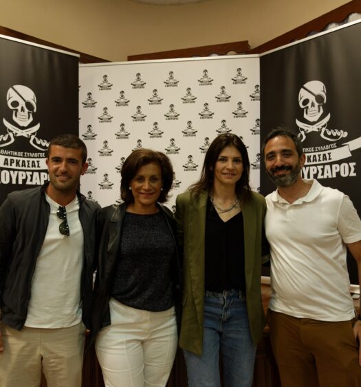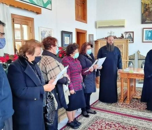 (από δεξιά), ο πάτερ Ιωάννης με τους Βάσο Χαλκιά (πρόεδρος), Ανδρέα Διάκο (αντιπρόεδρο), Μανώλη Κασσώτη (ιδρυτικό μέλος του Ιδρύματος).