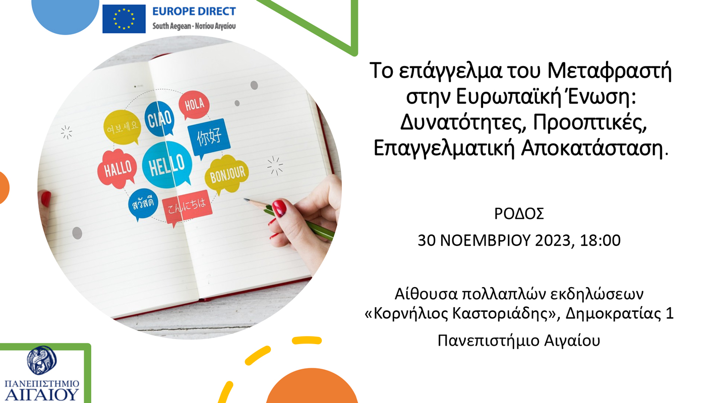 Με αφορμή τον εορτασμό της ευρωπαϊκής ημέρας γλωσσών, το Europe Direct Νοτίου Αιγαίου της ΑΝΔΩ Α.Ε, το Παιδαγωγικό Τμήμα Δημοτικής Εκπαίδευσης, το Τμήμα Επιστημών της Προσχολικής Αγωγής και του Εκπαιδευτικού Σχεδιασμού και το Τμήμα Μεσογειακών Σπουδών, του Πανεπιστημίου Αιγαίου συνδιοργανώνουν δράση με θέμα το επάγγελμα του μεταφραστή στα πλαίσια της Ευρωπαϊκής Ένωσης.