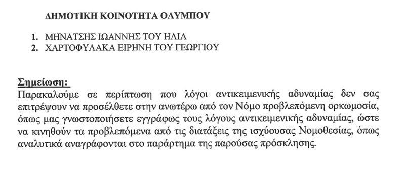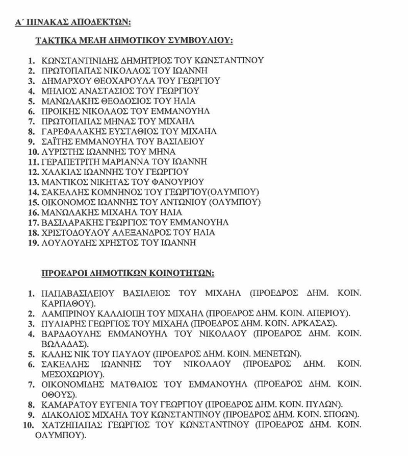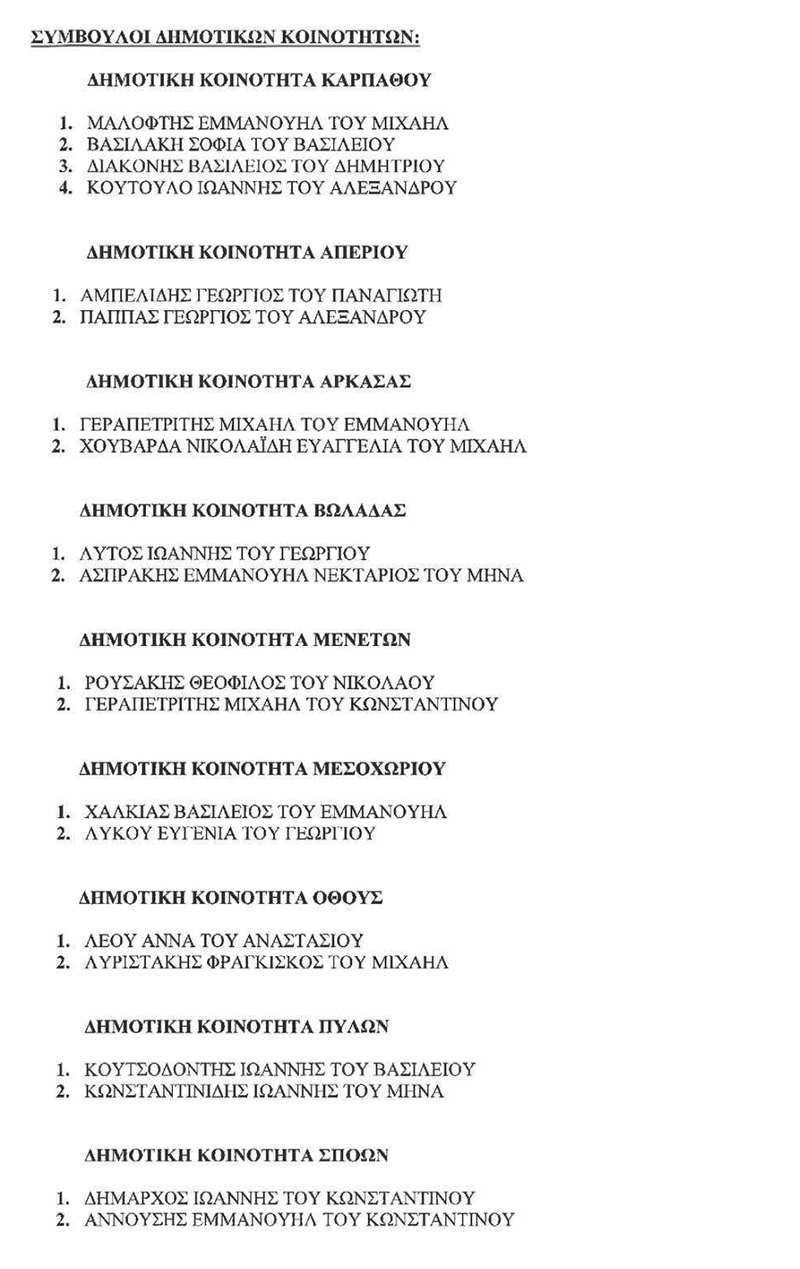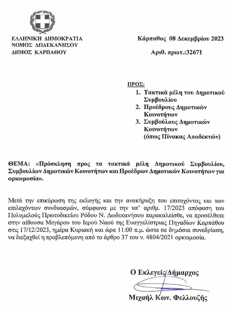O Εκλεγείς Δήμαρχος Καρπάθου Μιχάλης Κωνσταντίνου Φελλουζής προσκαλεί τα τακτικά μέλη του Δημοτικού συμβουλίου, Προέδρους Δημοτικών Κοινοτήτων και Συμβούλων Δημοτικών Κοινοτήτων στις 17 Δεκεμβρίου 2023, ημέρα Κυριακή και ώρα 11 π.μ. στην αίθουσα Μεγάρου του Ιερού Ναού της Ευαγγελίστριας Πηγαδίων ώστε σε δημόσια συνεδρίαση να διεξαχθεί η προβλεπόμενη ορκωμοσία.