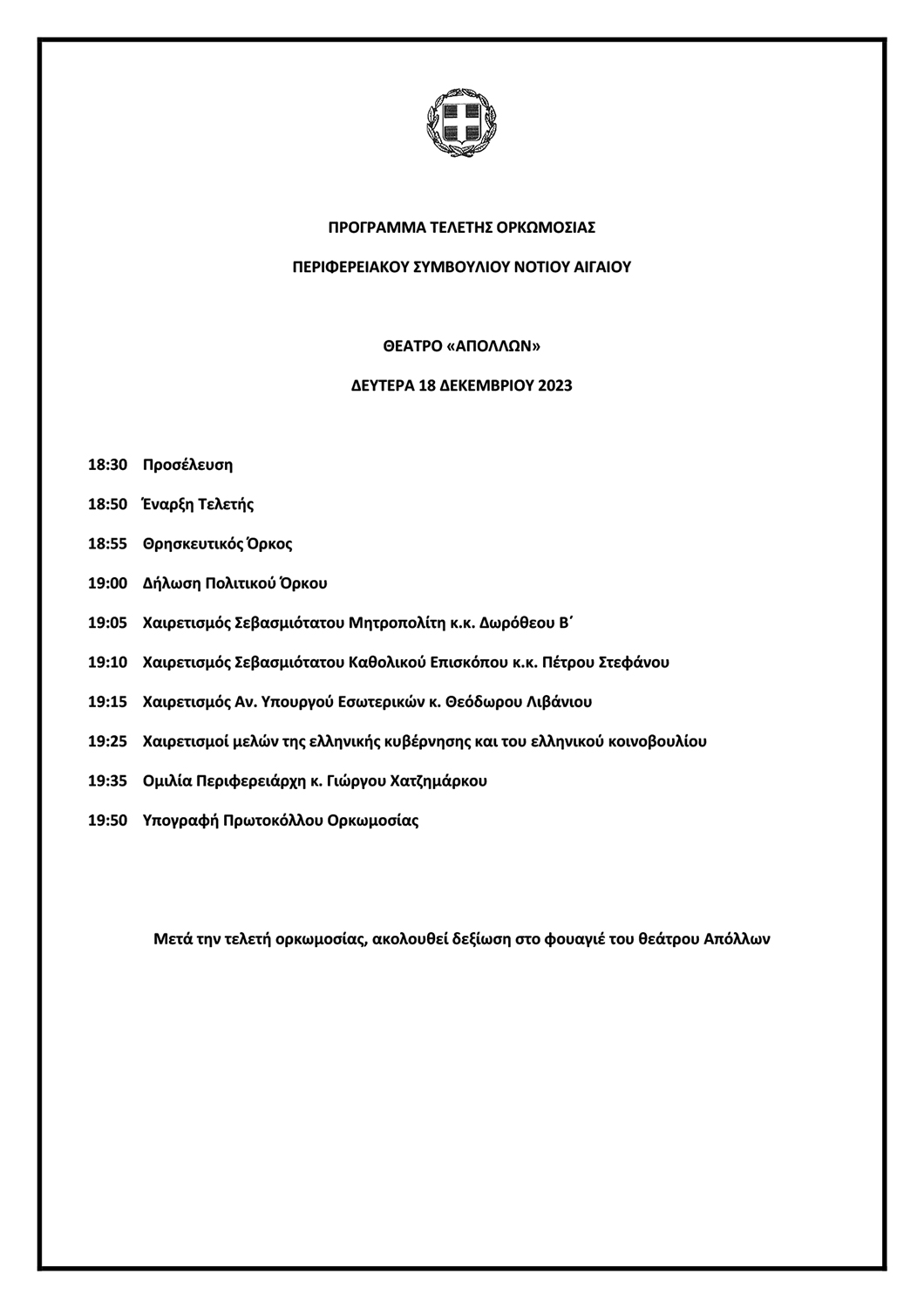 Ακολουθεί το πρόγραμμα της τελετής ορκωμοσίας.