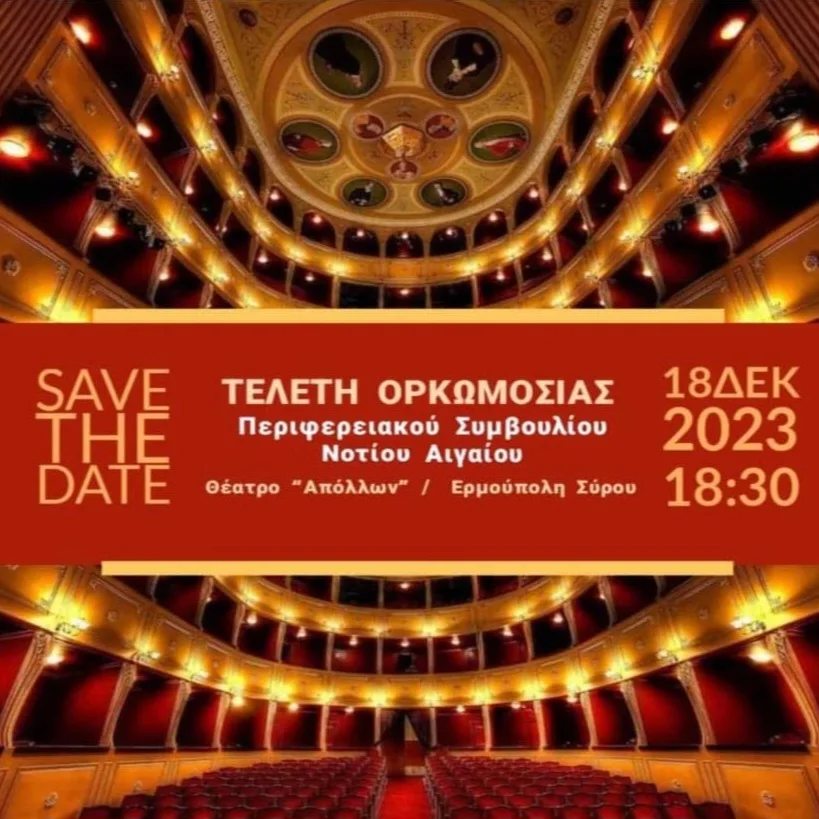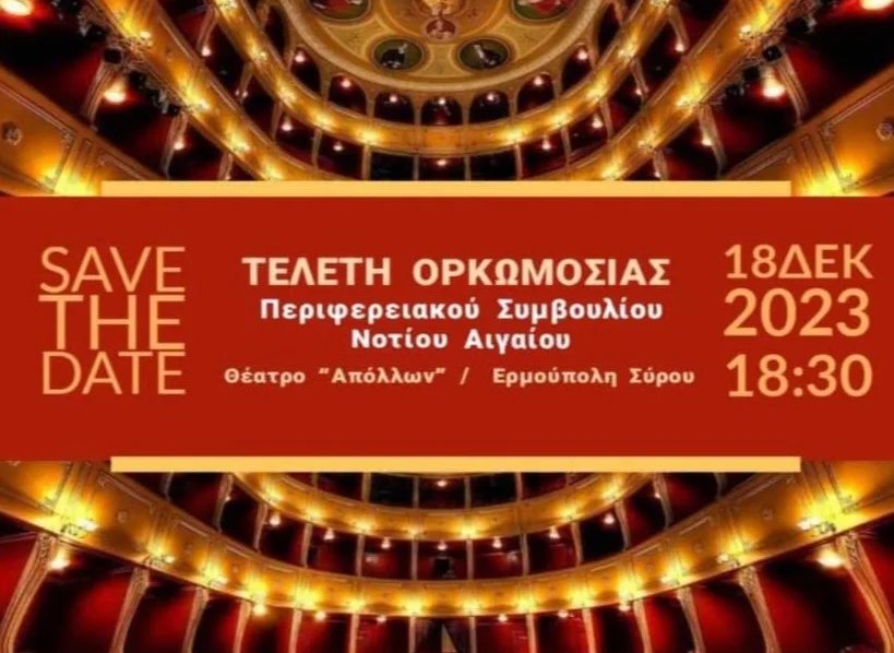 Στην Σύρο θα βρεθούν, την Δευτέρα 18 Δεκεμβρίου, ο Περιφερειάρχης Νοτίου Αιγαίου, Γιώργος Χατζημάρκος και οι περιφερειακοί σύμβουλοι που εκλέχθηκαν στις περιφερειακές εκλογές της 8ης Οκτωβρίου για την τελετή ορκωμοσίας του νέου περιφερειακού συμβουλίου, που θα πραγματοποιηθεί στο θέατρο Απόλλων της Ερμούπολης Σύρου στις 18.30.