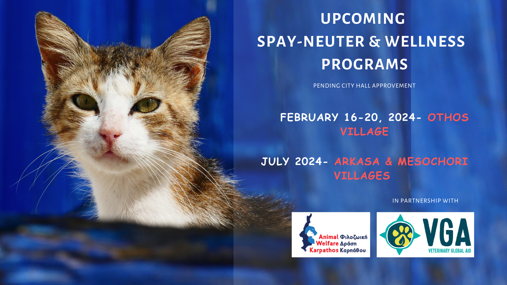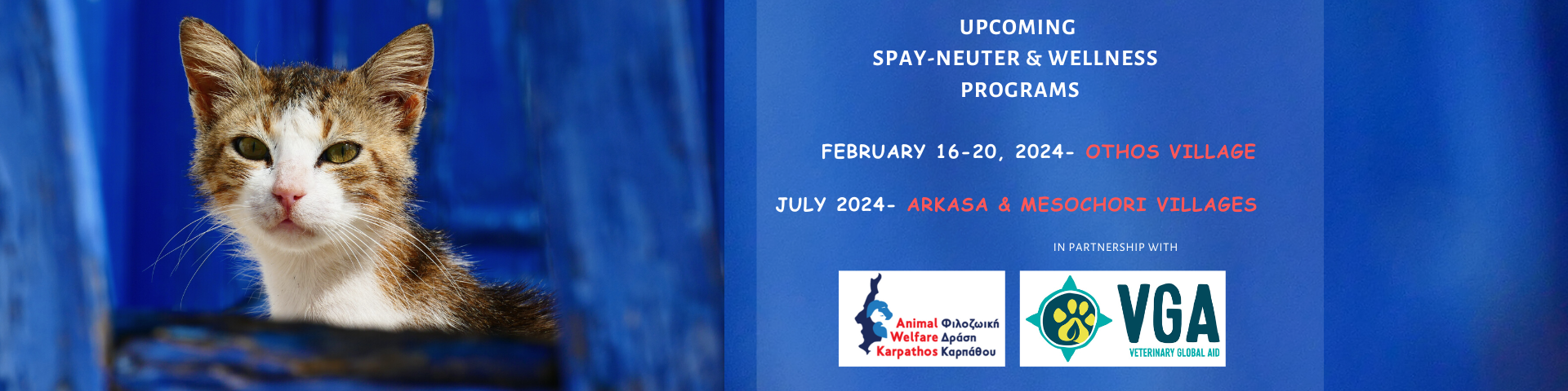 It is with excitement that we would like to announce our two upcoming spay/neuter and wellness programs for 2024. The programs will take place in Othos village (February 16-20th, 2024) and Arkasa village (July 2024). Through our July program we intend to help cats from Leukos and Mesochori as well. Dr. Anna Katogiritis will lead both programs with the help of volunteer veterinarians and licensed veterinary nurses. Our applications have already been submitted to the City Hall for review. The programs are being organized in collaboration with Veterinary Global Aid, Inc a US 501(c)3 non profit.