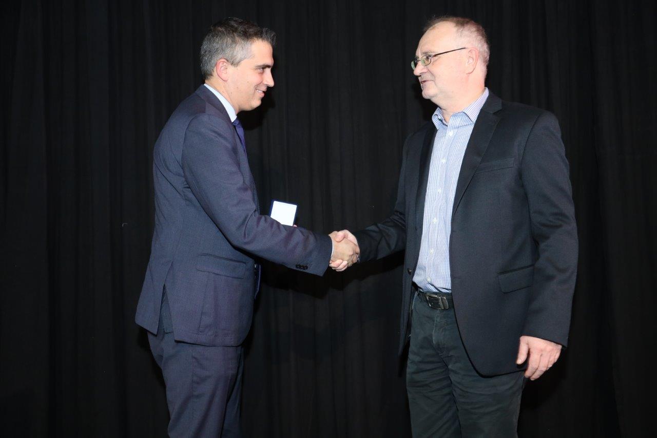 Ο υφυπουργός Χρίστος Δήμας δίνει το μετάλλιο στον Θεοχάρη Λιβιεράτο εκ Πατρών 1ο νικητή σεναρίου μεγάλου μήκους