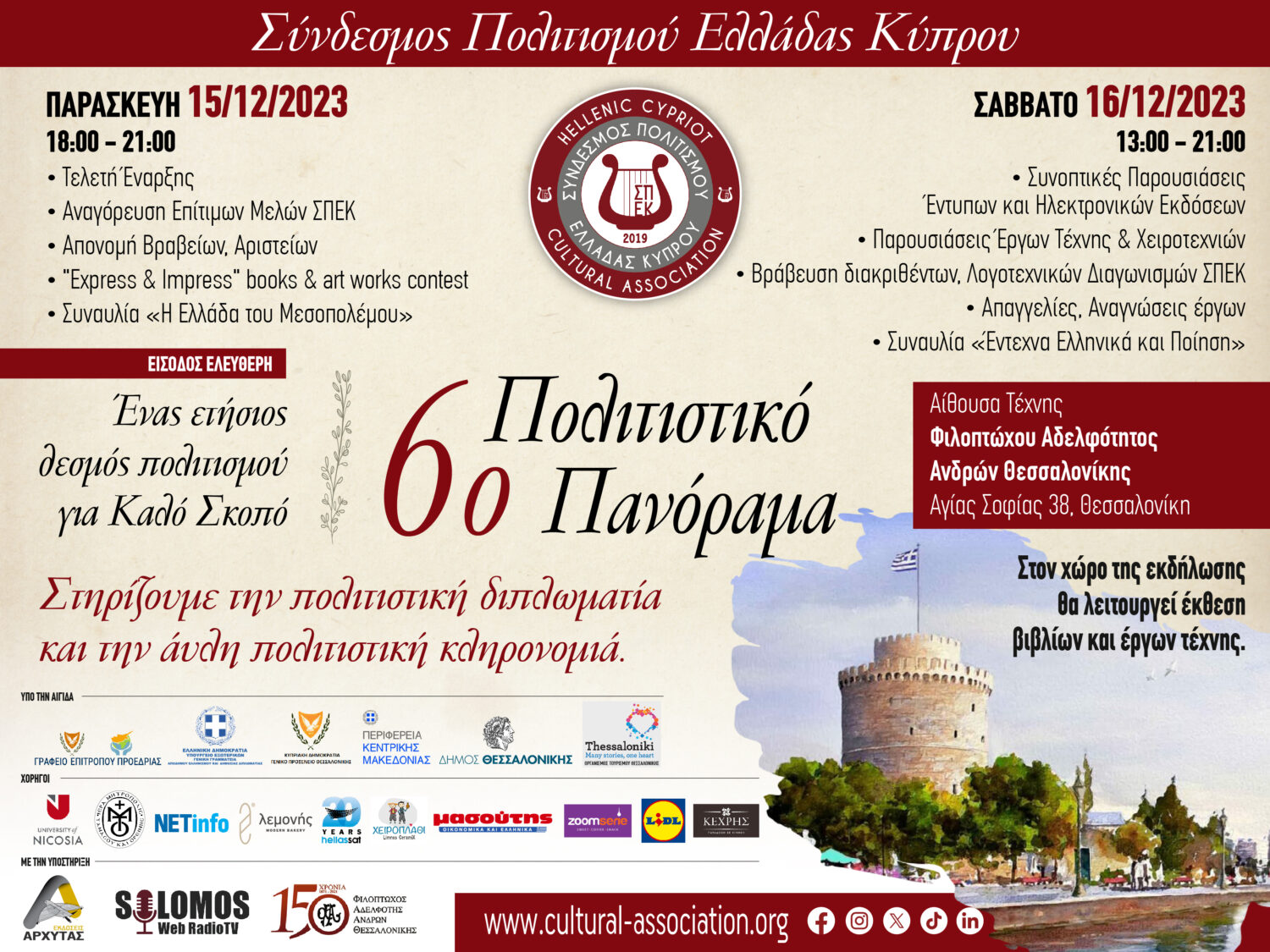 Με μεγάλη επιτυχία πραγματοποιήθηκε τo 6ο Πολιτιστικό Πανόραμα του Συνδέσμου Πολιτισμού Ελλάδας Κύπρου ΣΠΕΚ [1] το διήμερο 15 και 16 Δεκεμβρίου 2023, στην αίθουσα τέχνης της Φ.Α.Α.Θ. Αγίας Σοφίας 38, στο κέντρο της Θεσσαλονίκης.