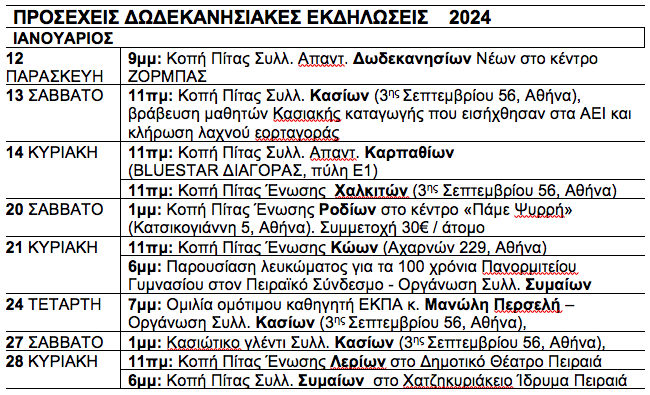 - Σάββατο 3/2, 2μμ: Κοπή Βασιλόπιττας στο μουσικό μεζεδοπωλείο «ΠΡΟΞΕΝΑΙΟ» (Καραολή κ΄ Δημητρίου 5, Πειραιάς)