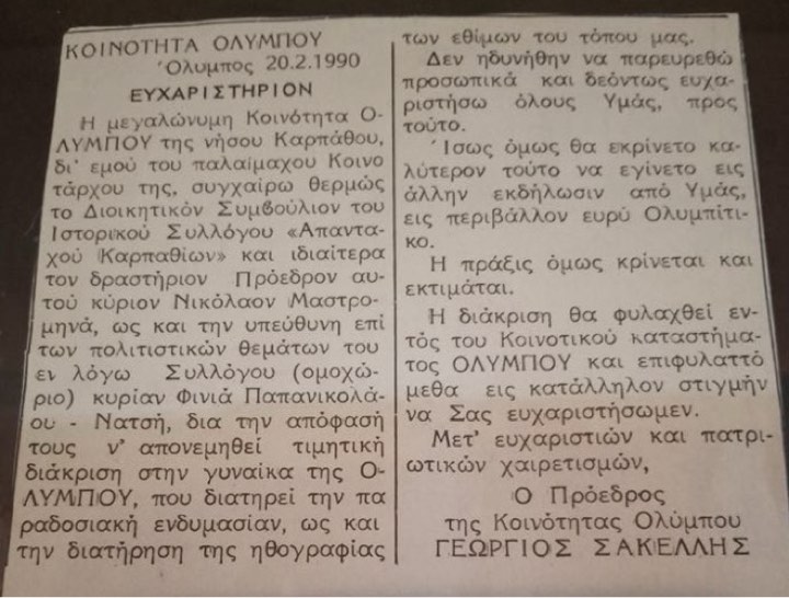 Ο τότε πρόεδρος της Ολύμπου Καρπάθου αείμνηστος Γιώργος Σακέλλης έστειλε στην εφ. “ΚΑΡΠΑΘΙΑΚΗ” το παρακάτω: