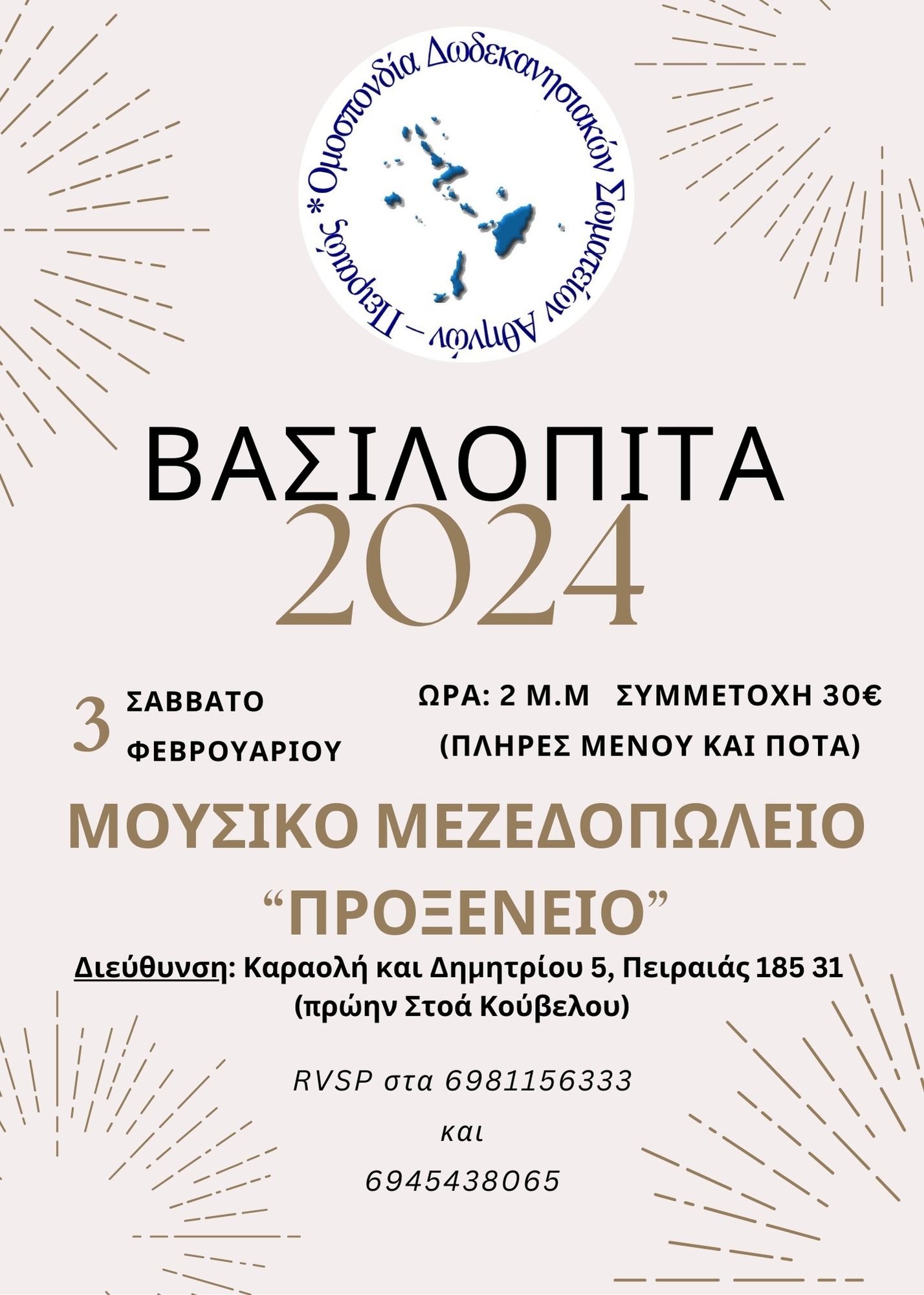 - Σάββατο 3/2, 2μμ: Κοπή Βασιλόπιττας στο μουσικό μεζεδοπωλείο «ΠΡΟΞΕΝΑΙΟ» (Καραολή κ΄Δημητρίου 5, Πειραιάς)