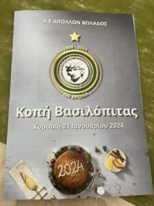 Με λαμπρότητα πραγματοποιήθηκε η Κοπή της Πρωτοχρονιάτικης Βασιλόπιτας του Α.Σ Απόλλων Βωλάδος την Κυριακή 21 Ιανουαρίου 2024 στο Εκκλησιαστικό Μέγαρο Βωλάδας.