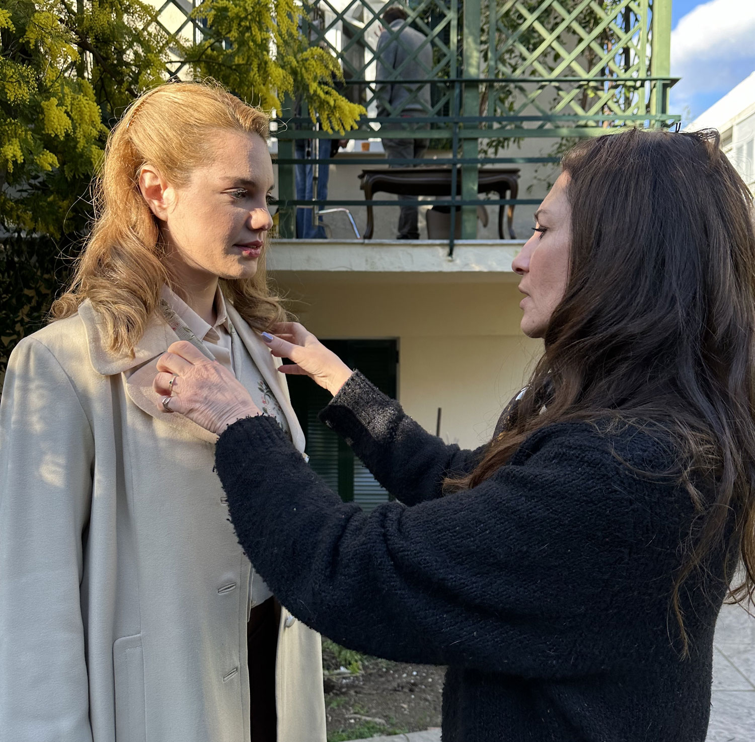H ενδυματολόγος Δομνίκη Βασιαγεώργη φροντίζει τις λεπτομέρειες στα ρούχα της Ευγενίας Ξυγκόρου πριν από το γύρισμα.