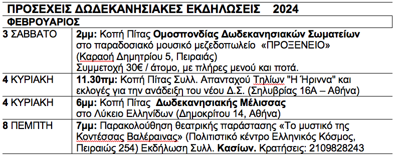Από 1/1/24, ισχύει ο επιμερισμός εξόδων λειτουργίας της Δωδεκανησιακής μας Εστίας, μεταξύ των συστεγαζόμενων Σωματείων, σύμφωνα με σχετική απόφαση της ΓΣ της 7/12/23. Παράλληλα και λαμβάνοντας υπόψη τις δυσκολίες που βιώνουν όλα τα Δωδεκανησιακά Σωματεία, το ΔΣ της Ομοσπονδίας μας θα συνεχίσει τις προσπάθειες για την εξασφάλιση των παγίων εξόδων, που δεν υπερβαίνουν τα 5.000 ευρώ κάθε χρόνο, ευελπιστώντας σε μια θετική ανταπόκριση από την Περιφέρεια Ν. Αιγαίου. Συναφές και σοβαρότατο πρόβλημα αποτελεί η ανάγκη διάσωσης του Δωδεκανησιακού Αρχείου (Δωδεκανησιακή Ιστορική κ΄ Λαογραφική Εταιρεία, Πολιτιστικό Ίδρυμα Δωδεκανήσου «Κλεόβουλος ο Λίνδιος», Εταιρεία Καρπαθιακών Μελετών, κλπ), το οποίο κινδυνεύει να καταλήξει στην πολτοποίηση!