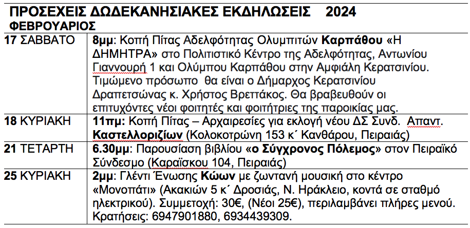- Την 14/2 πραγματοποιήθηκε ευρεία συνεδρίαση της οργανωτικής επιτροπής, με την φυσική παρουσία του Δημάρχου στην Αθήνα, ενώ συμμετείχαν άτομα διαδικτυακά από Αθήνα, Κάσο, Κάρπαθο και Αμερική. Είχε προηγηθεί συνάντηση στο Υπουργείο Ναυτιλίας με τον Υφυπουργό κ. Γιάννη Παππά. Ο συντονιστής της Επιτροπής κ. Ντίνος Ζαχάρης ενημέρωσε για τις εξελίξεις στα θέματα: έκδοσης αναμνηστικού νομίσματος, έκδοσης σειράς αναμνηστικών γραμματοσήμων, δημιουργία σελιδοδείκτη, δημιουργία ραδιοφωνικού και τηλεοπτικού σποτ, σύνταξη κειμένων για τα περιοδικά των εταιρειών ATTICA AEGEAN