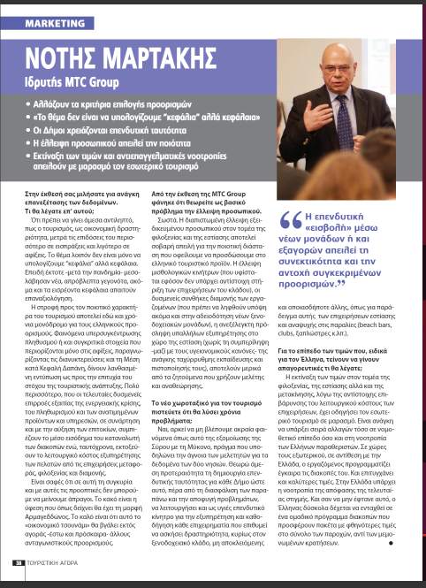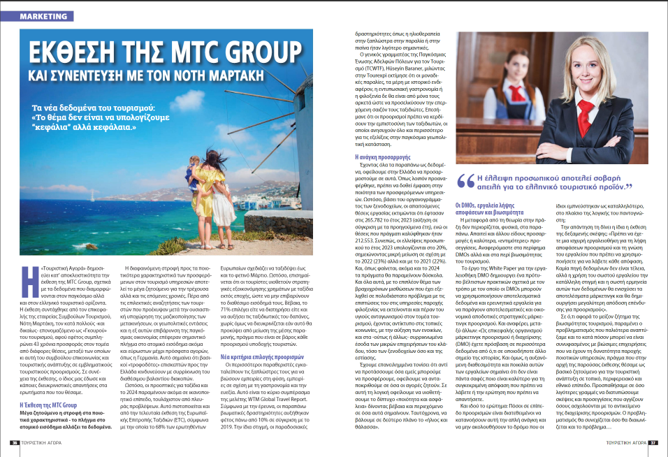 Η «Τουριστική Αγορά» δημοσιεύει κατά αποκλειστικότητα στο τεύχος που μόλις κυκλοφόρησε έκθεση της MTC GROUP σχετικά με τα δεδομένα που διαμορφώνονται στον παγκόσμιο αλλά και τον ελληνικό τουριστικό ορίζοντα. Και, όπως αναφέρει το περιοδικό στο εισαγωγικό του σημείωμα, “συντάχθηκε από τον επικεφαλής της εταιρίας συμβούλων τουρισμού Νότη Μαρτάκη, τον κατά πολλούς – και δικαίως – επονομαζόμενο ως «Γκουρού» του τουρισμού, αφού εφέτος συμπληρώνει 43 χρόνια προσφοράς στον τομέα από διάφορες θέσεις.