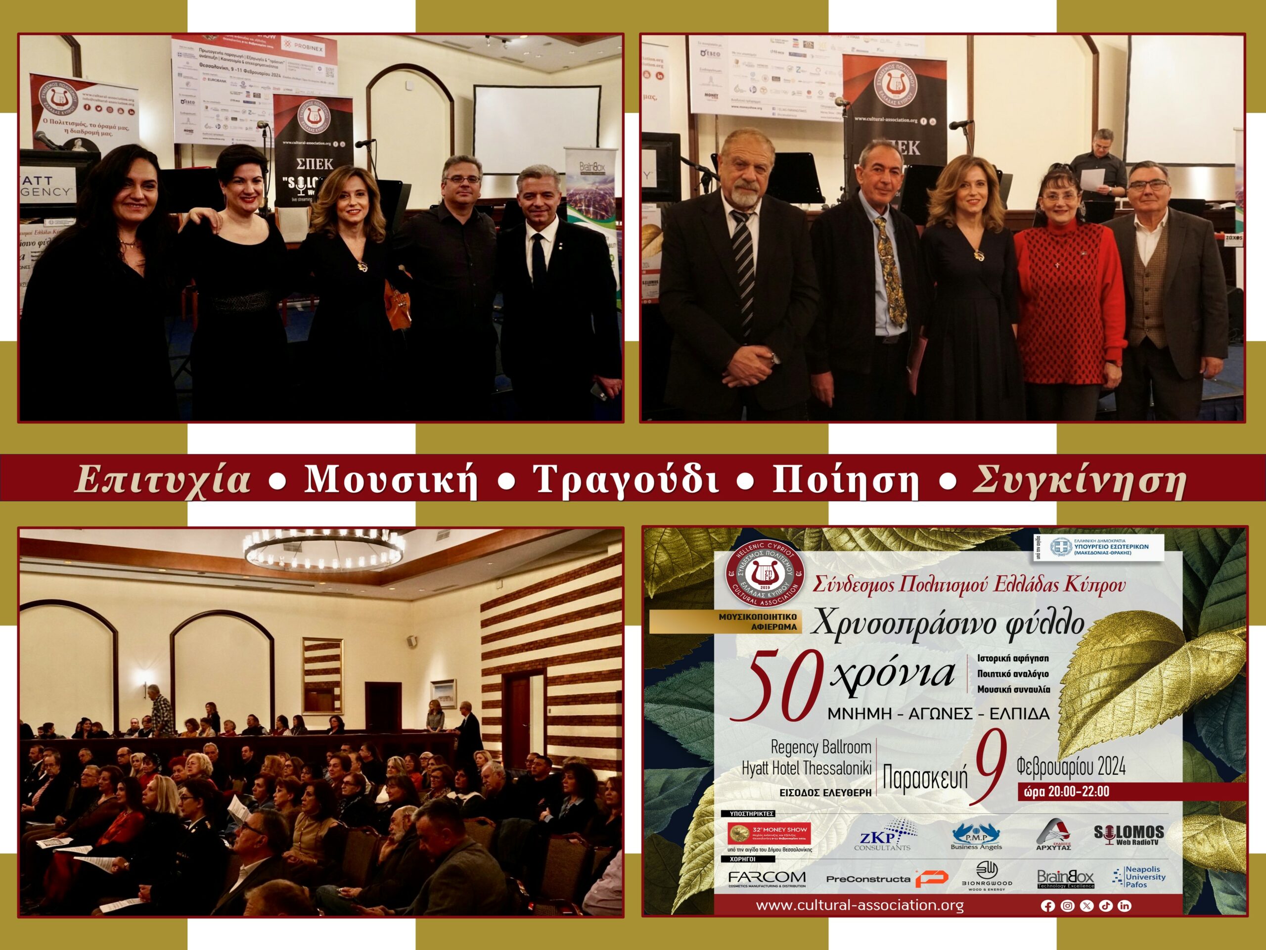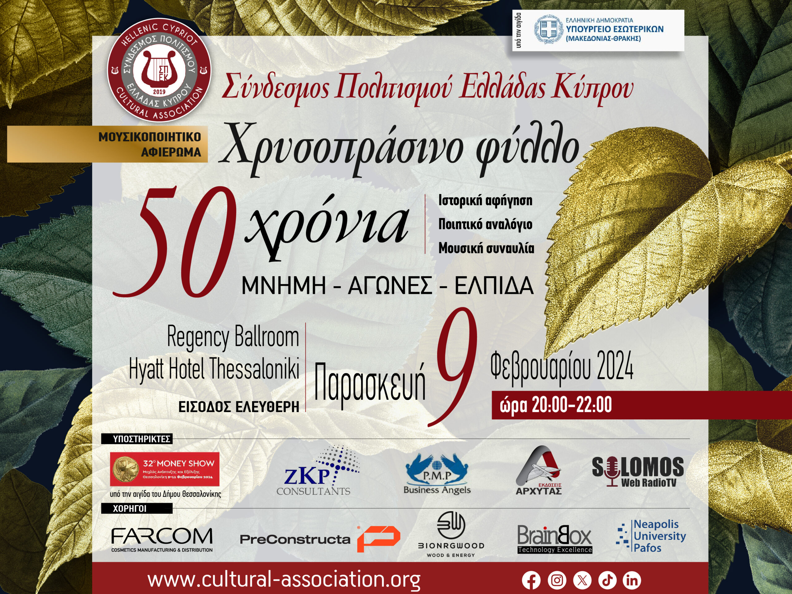 Συγκεκριμένα, ο Σύνδεσμος Πολιτισμού Ελλάδας Κύπρου υπό την αιγίδα του Υπουργείου Εσωτερικών (Μακεδονίας – Θράκης) της Ελληνικής Δημοκρατίας, πραγματοποίηση με μεγάλη επιτυχία το μουσικοποιητικό αφιέρωμα με τίτλο “Χρυσοπράσινο Φύλλο: 50 Χρόνια Μνήμη – Αγώνες – Ελπίδα”, την Παρασκευή 9 Φεβρουαρίου 2024 και ώρα 20:00-22:00, στην αίθουσα Regency Ballroom του ξενοδοχείου Hyatt στη Θεσσαλονίκη, στο πλαίσιο του 32ου Money Show, που διοργανώνεται από το Ελληνο-Ιταλικό Επιμελητήριο Θεσσαλονίκης και την Organotecnica, σε συνεργασία με το Εμπορικό και Βιομηχανικό Επιμελητήριο Θεσσαλονίκης (ΕΒΕΘ) και ευρύτερα υπό την αιγίδα του υπουργείου Εσωτερικών (τομέας Μακεδονίας-Θράκης), της περιφέρειας Κεντρικής Μακεδονίας και του δήμου Θεσσαλονίκης.