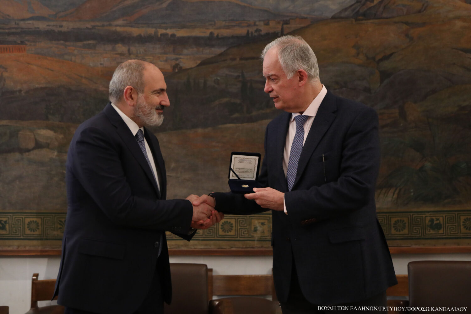 Ακολούθως, ο Πρόεδρος της Βουλής των Ελλήνων απένειμε το Χρυσό Μετάλλιο της Βουλής των Ελλήνων, στον κ. Nikol Pashinyan λέγοντας χαρακτηριστικά: «Είναι ένα χρυσό νόμισμα από την Ελληνική Επανάσταση κατά της οθωμανικής αυτοκρατορίας, που επάξια το δίνω στον αρμενικό λαό μέσω των δικών σας χεριών».