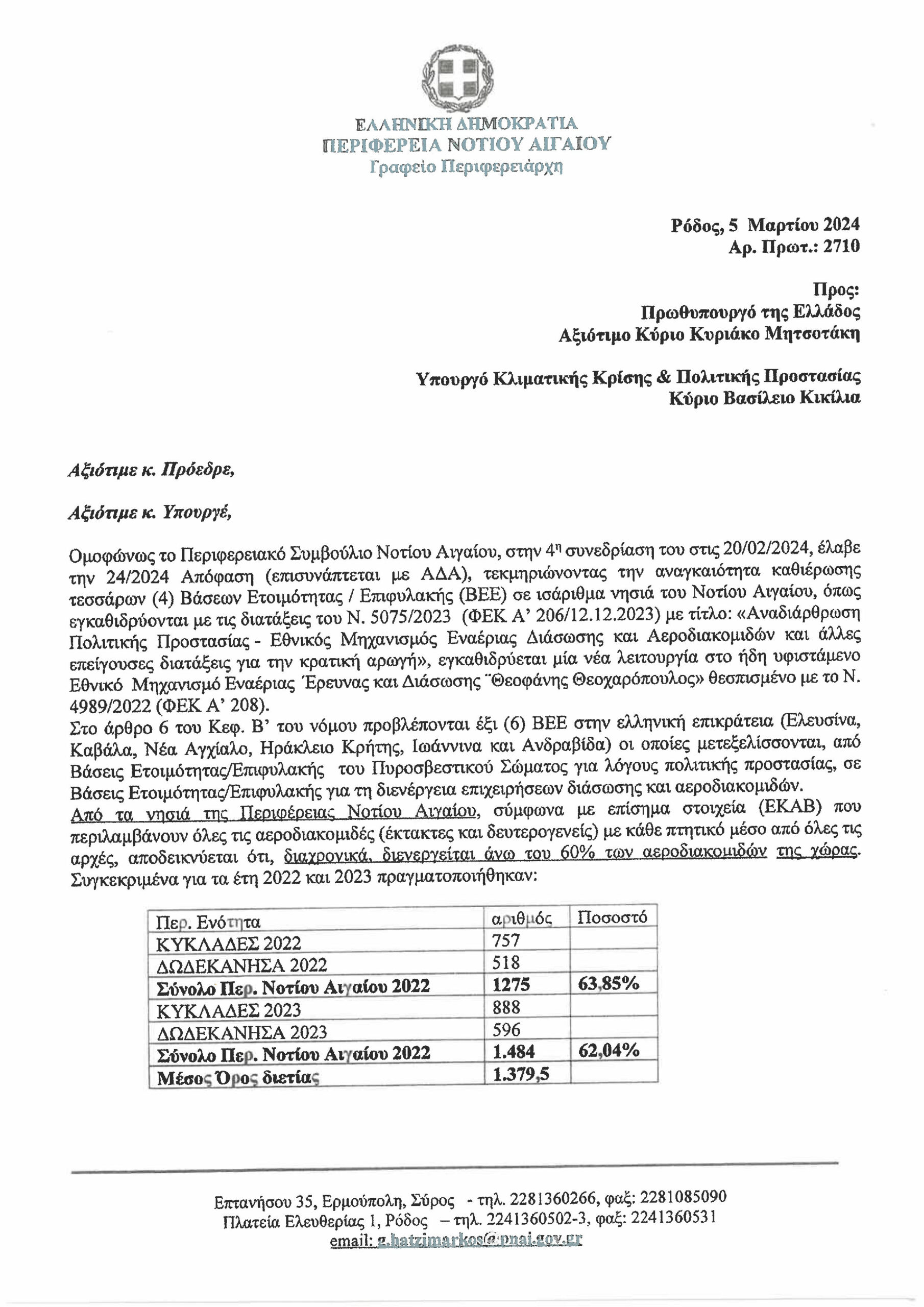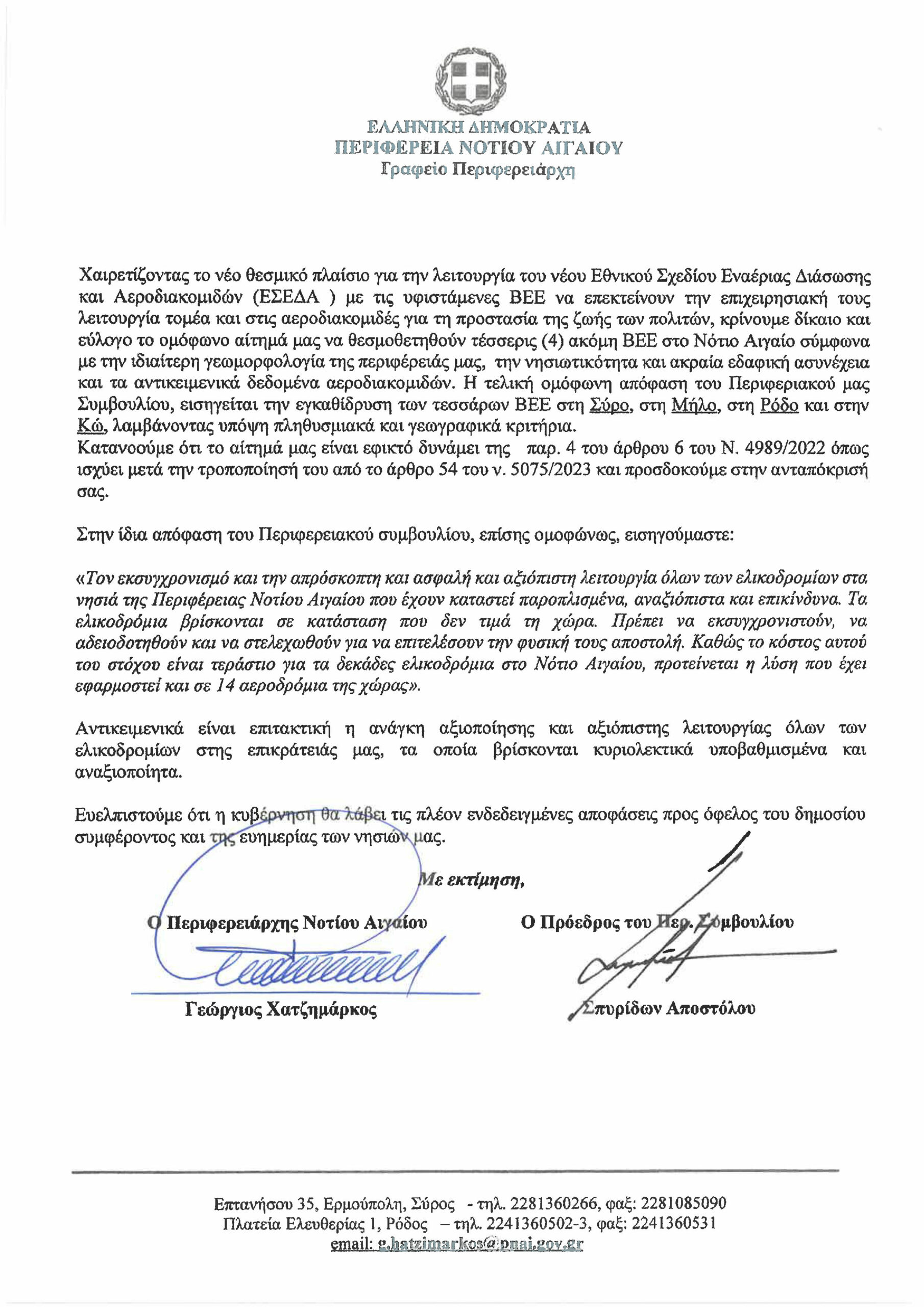 Αυτό ήταν το θέμα της επιστολής που απέστειλε στον Πρωθυπουργό, Κυριάκο Μητσοτάκη και τον αρμόδιο Υπουργό Κλιματικής Κρίσης και Πολιτικής Προστασίας, Βασίλη Κικίλια, σε συνέχεια της ομόφωνης απόφασης 24/2024 του Περιφερειακού Συμβουλίου Νοτίου Αιγαίου.