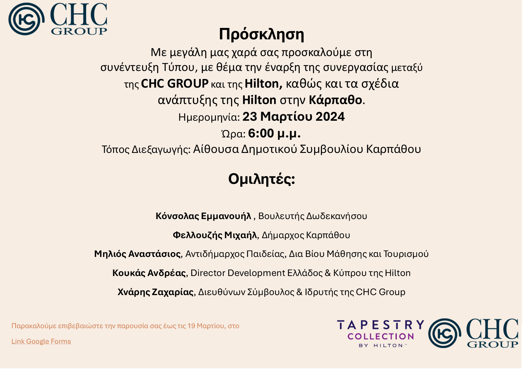 Ο κ. Ζαχαρίας Χνάρης, CEO της CHC Group, και ο κ. Ανδρέας Κουκάς, Director Development Ελλάδος & Κύπρου της Hilton, σας προσκαλούν να παρευρεθείτε την 23η Μαρτίου και ώρα 6:00 μ.μ. στην αίθουσα του Δημοτικού Συμβουλίου του Δήμου Καρπάθου στην Συνέντευξη Τύπου με θέμα τα σχέδια ανάπτυξης της Hilton στην Κάρπαθο.